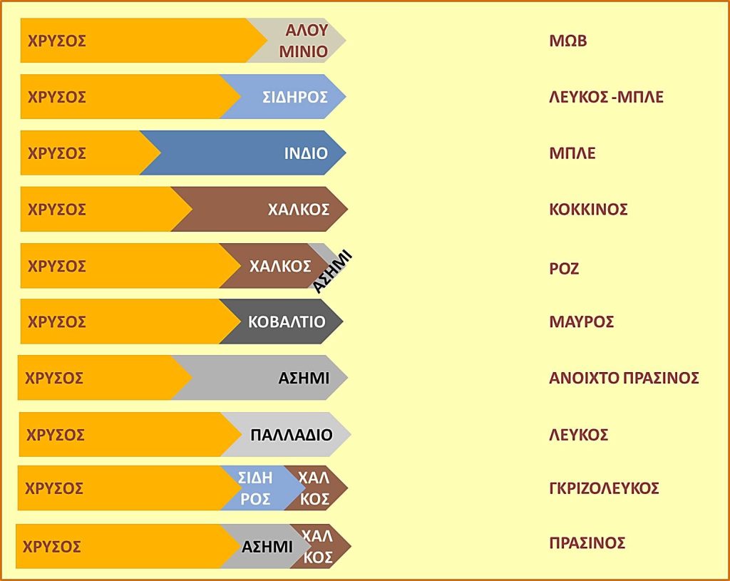 Ο χρυσοχόος μπορεί να δημιουργήσει διάφορους χρωματισμούς και να προσφέρει μια μεγάλη γκάμα αποχρώσεων που θα απευθύνεται σε κάθε γούστο.
