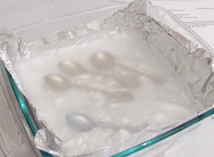 • Ρίχνουμε βραστό νερό τόσο όσο χρειάζεται για να καλύψει εντελώς τα ασημικά που θα βάλουμε μέσα.