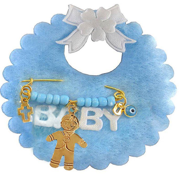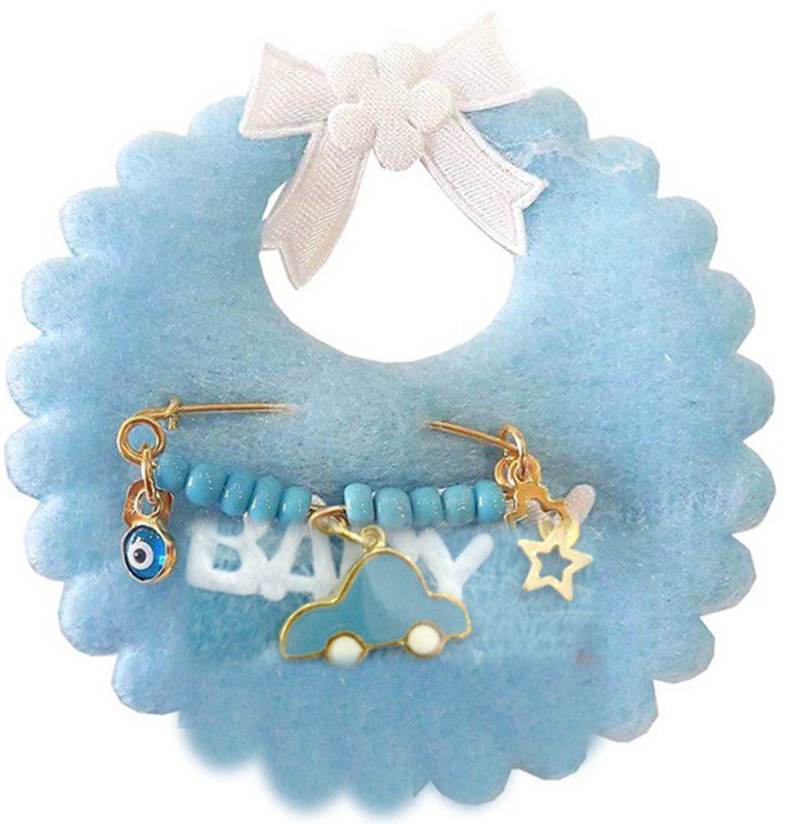 Ασημένια παραμάνα με κρεμαστό μοτίφ διακοσμημένη με χάντρες προσαρμοσμένη σε μοτίφ σαλιάρα από γαλάζια τσόχα.