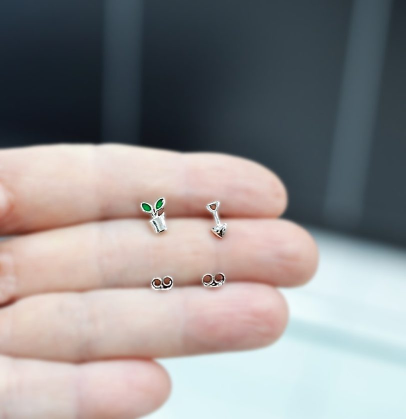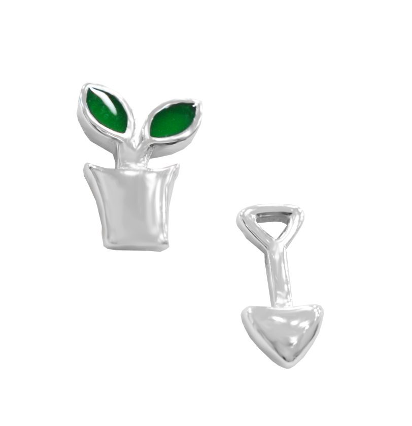 Ασημένια σκουλαρίκια γλάστρα με φτυάρι με επισμάλτωση.