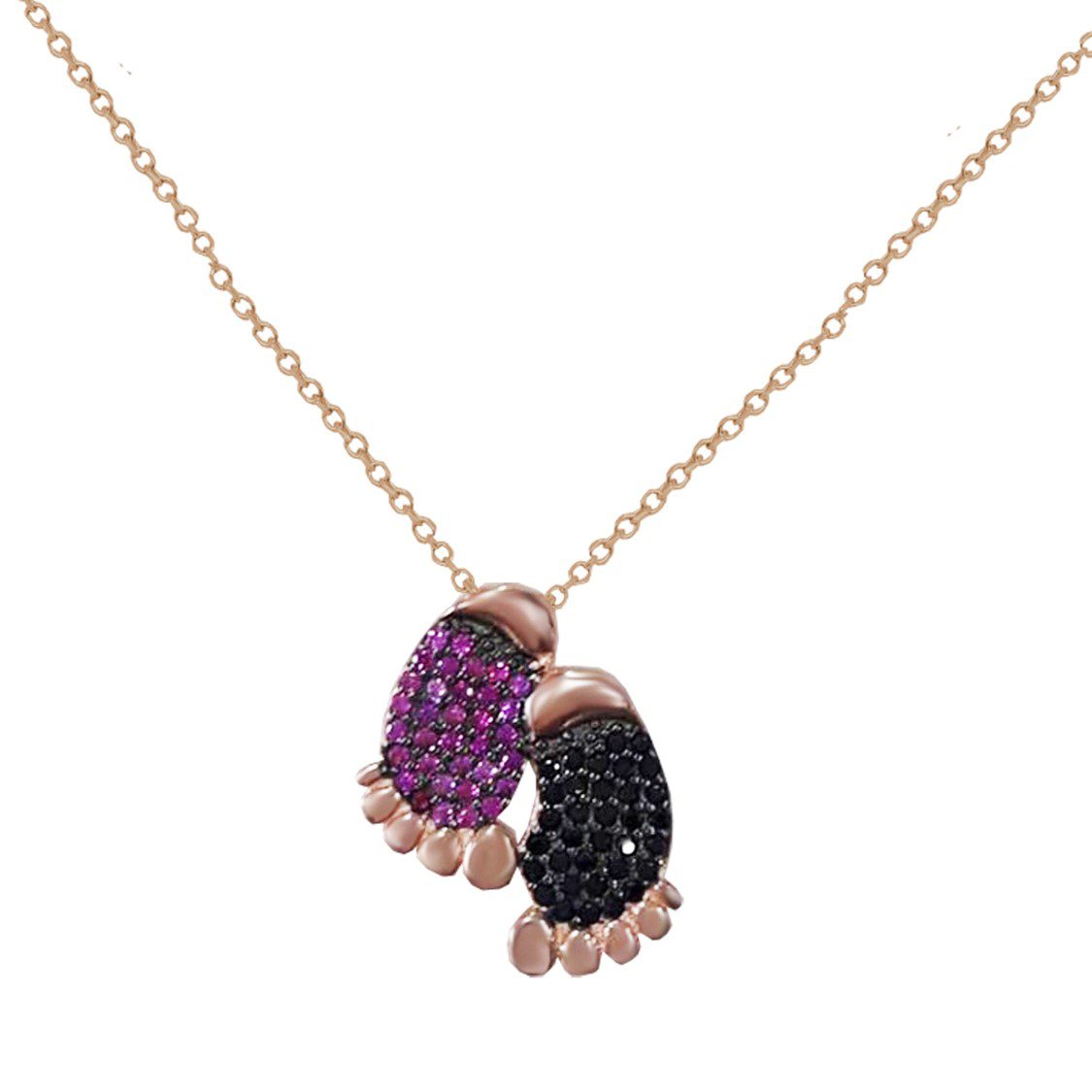 Ροζ ασημένιο κολιέ με κρεμαστό μοτίφ πατουσάκια με χρωματιστές πέτρες. Ένα ιδιαίτερο και όμορφο κόσμημα.