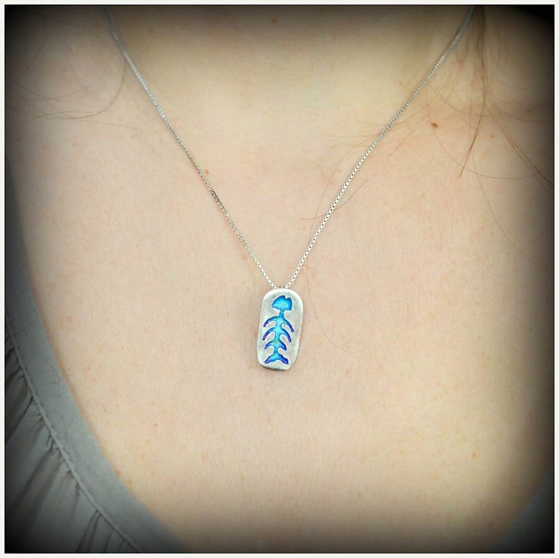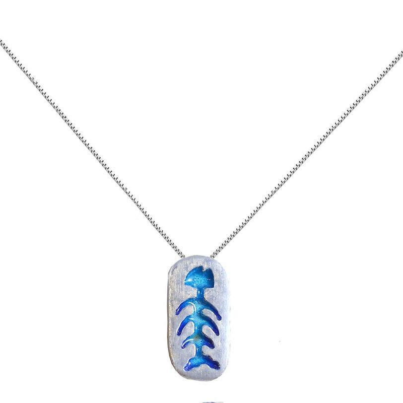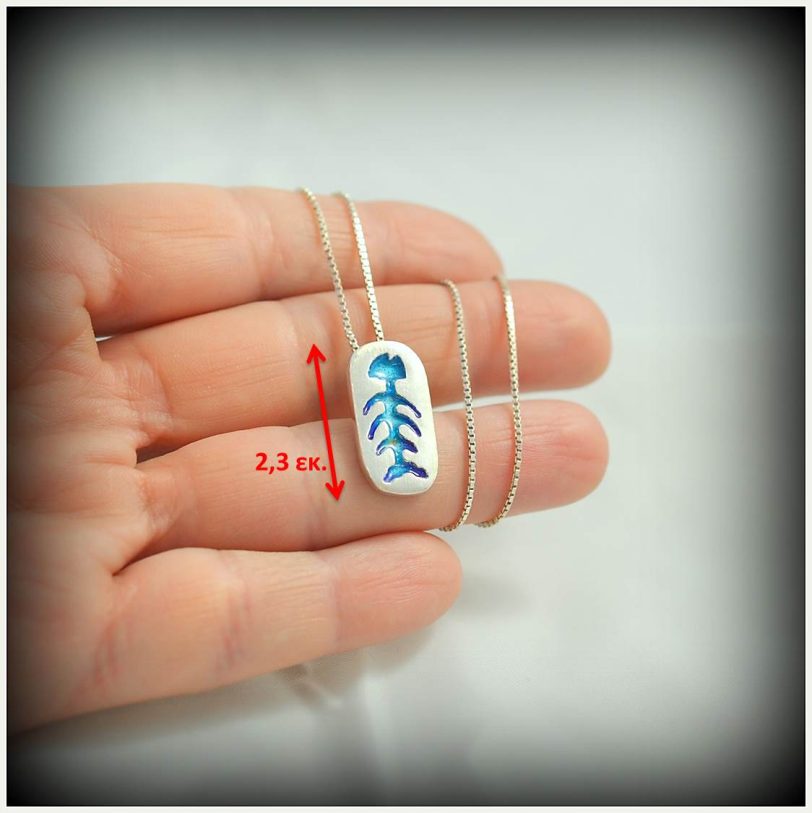Ασημένιο κολιέ με χειροποίητο ορθογώνιο μοτίφ με σμάλτο σε μπλέ σε σχέδιο ψαροκόκκαλο. Ένα νεανικό, μοντέρνο κόσμημα με χρώματα Ελλάδας.