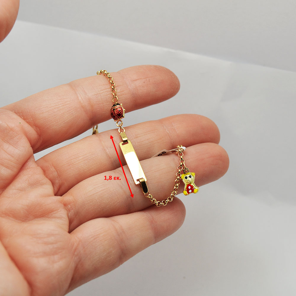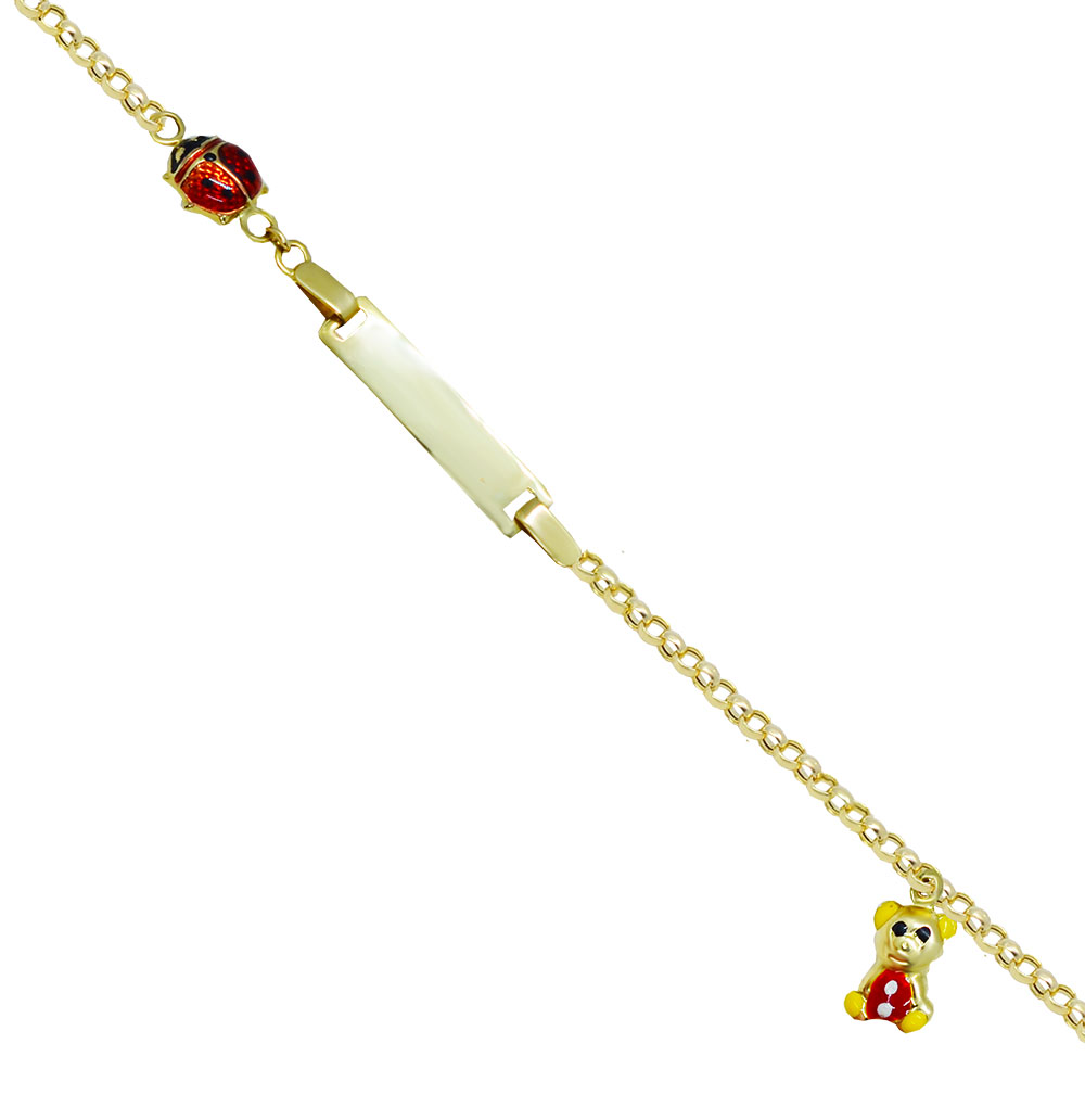 Χρυσή παιδική ταυτότητα με διακοσμητικά στοιχεία αρκουδάκι και πασχαλίτσα. Στην πλακέτα μπορείτε να μας ζητήσετε να χαράξουμε όνομα.
