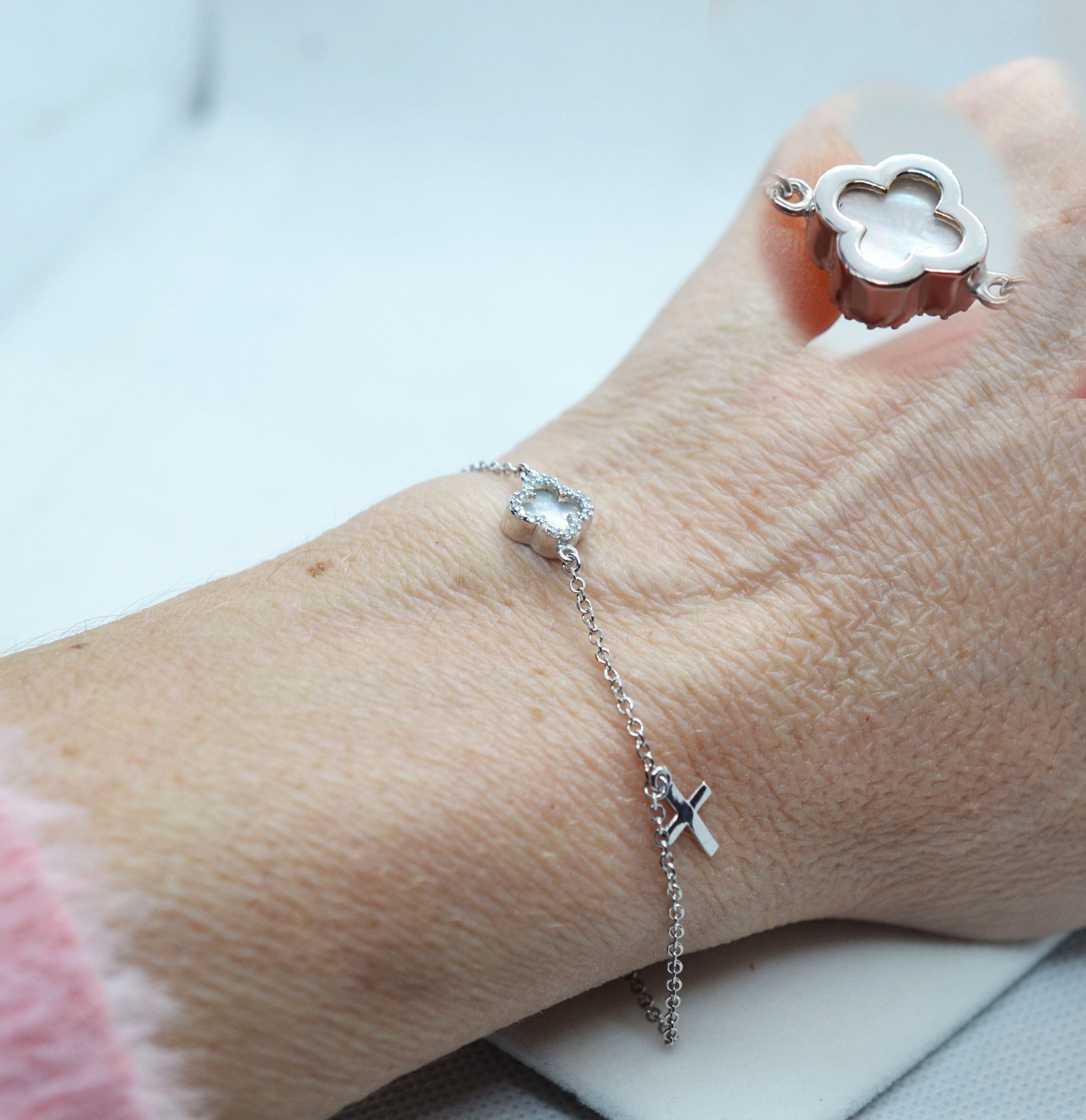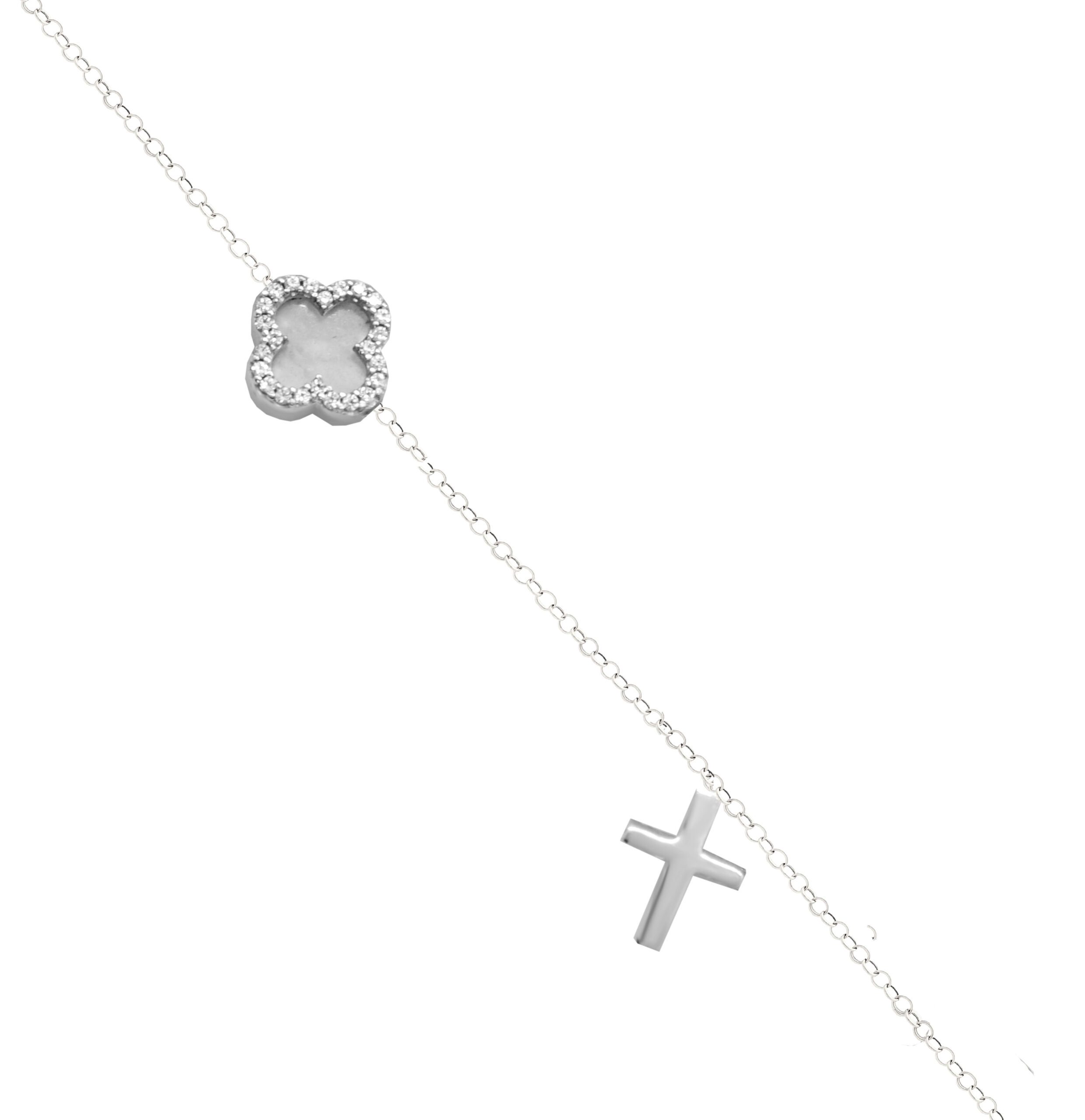 Λευκόχρυση αλυσίδα χεριού με μοτίφ τύπου Van Cleef και σταυρουδάκι.