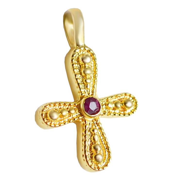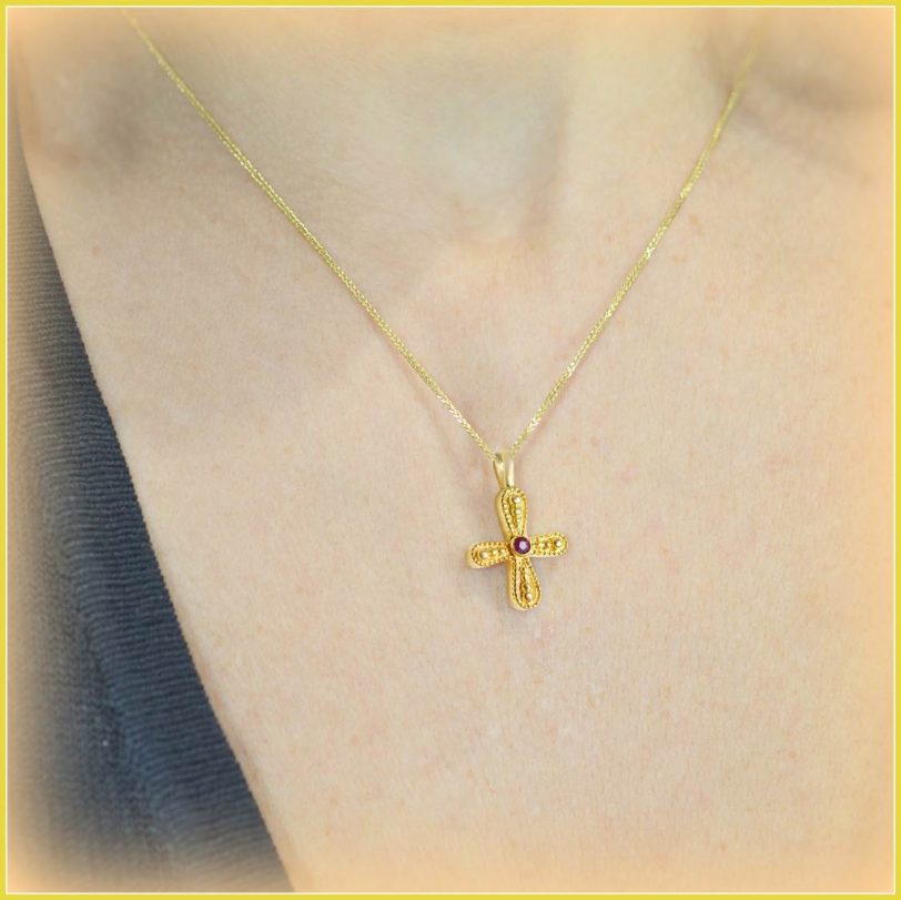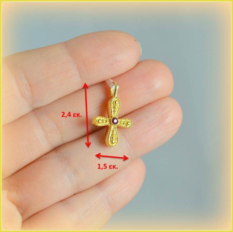 Μικρός χρυσός σταυρός με ανάγλυφα σχέδια και μωβ πέτρα στο κέντρο. Ένα κομψό κόσμημα που θα φορεθεί καθημερινά κι ένα υπέροχο δώρο για παιδάκια, για χρύσωμα ή για δωράκι σε αγαπημένο πρόσωπο.