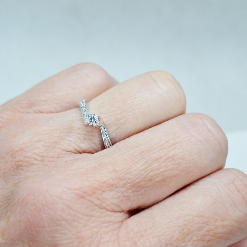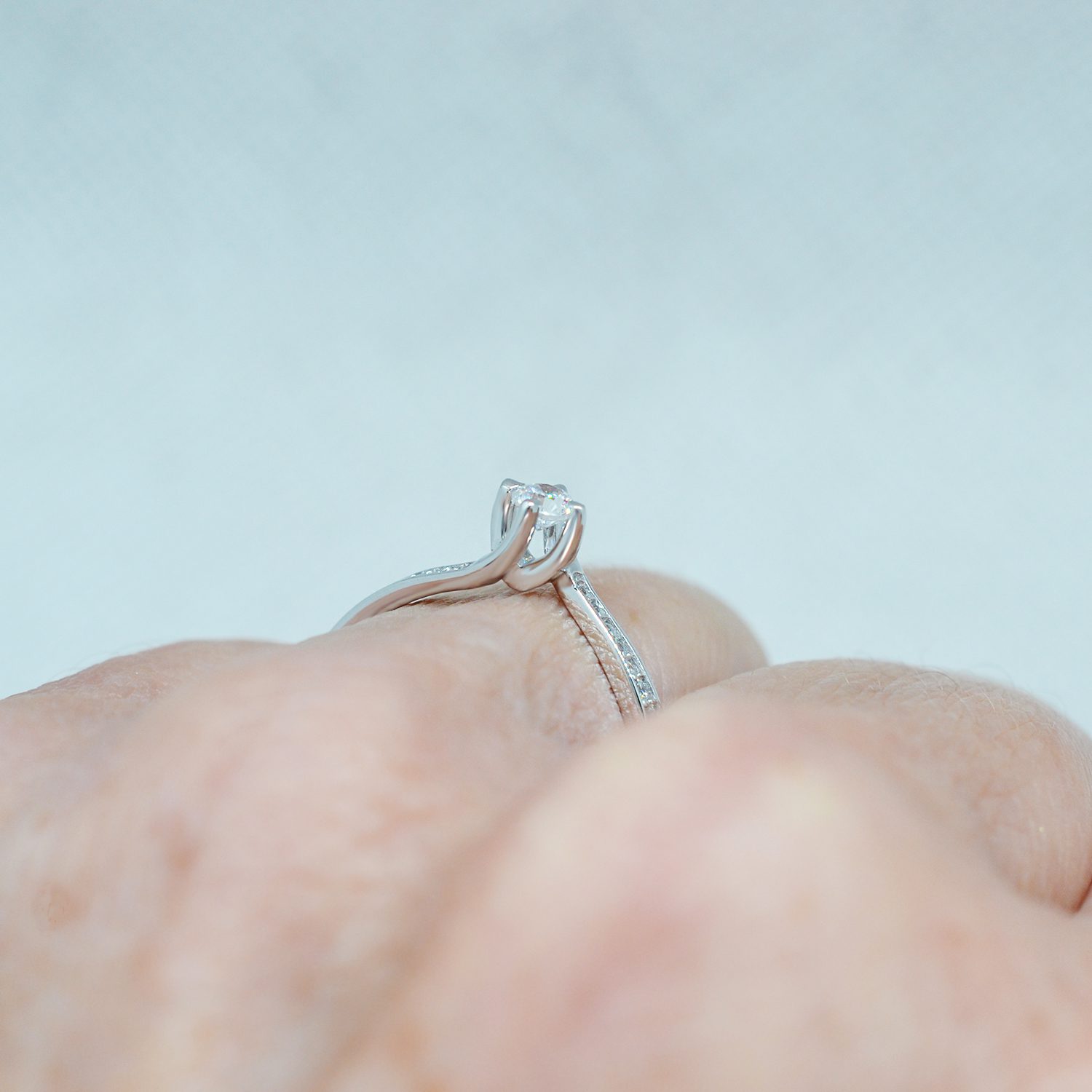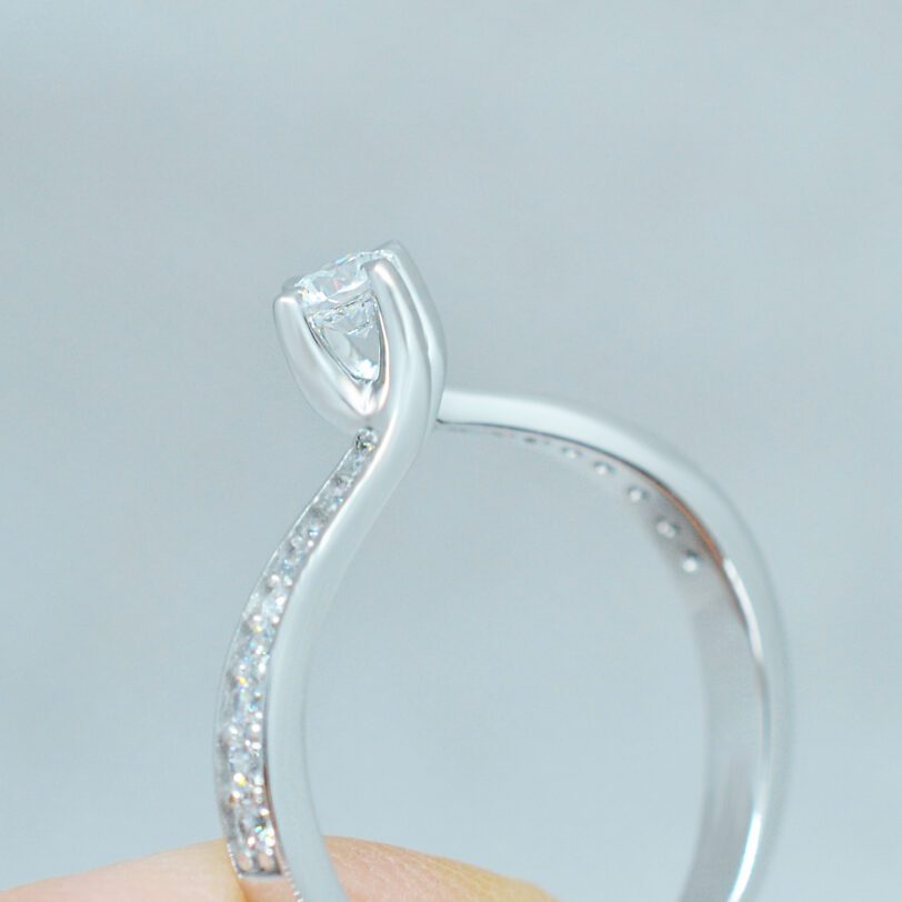 Λευκόχρυσο μονόπετρο δαχτυλίδι με διακοσμημένη με πέτρες γάμπα και κεντρική ζιργκόν πέτρα.