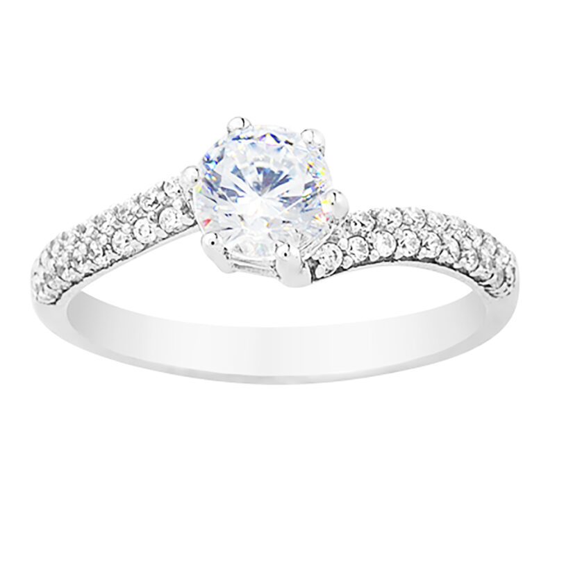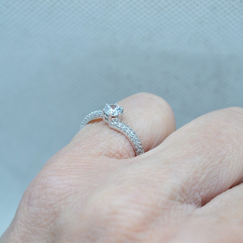 Λευκόχρυσο μονόπετρο δαχτυλίδι με διακοσμημένη με πέτρες γάμπα και κεντρική ζιργκόν πέτρα.
