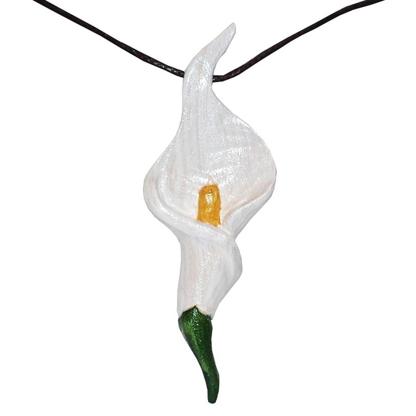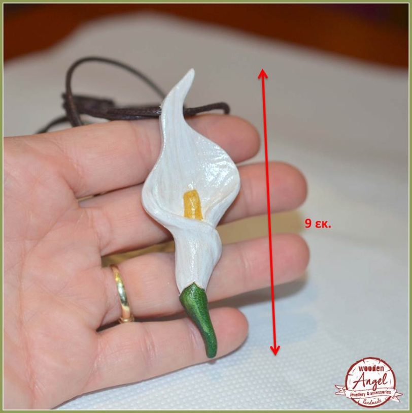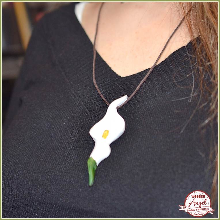 Ένα χειροποίητο ξυλόγλυπτο κολιέ με λευκό κρινάκι.