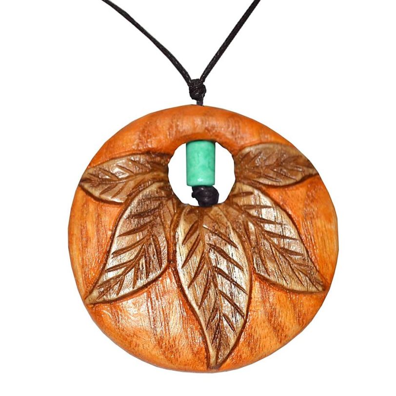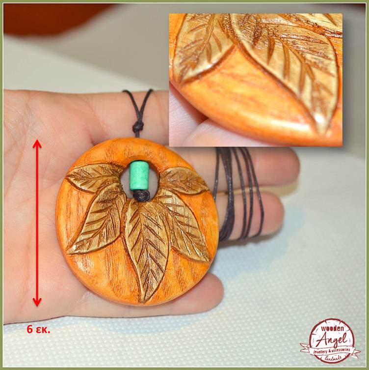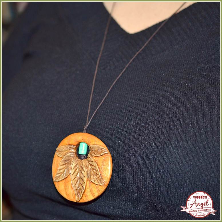 Ένα χειροποίητο ξυλόγλυπτο κολιέ με μεγάλο μοτίφ διακοσμημένο με σκαλιστά φύλλα. Ιδιαίτερη λεπτομέρεια η μακρόστενη τιρκουάζ χάντρα που συγκρατεί το κορδόνι με κόμπο.