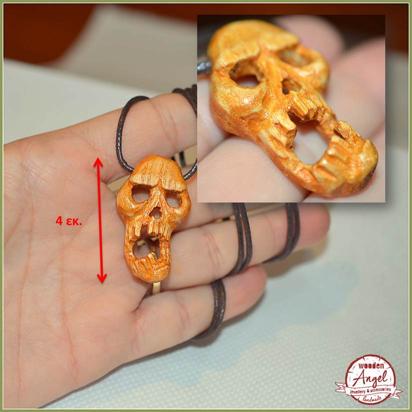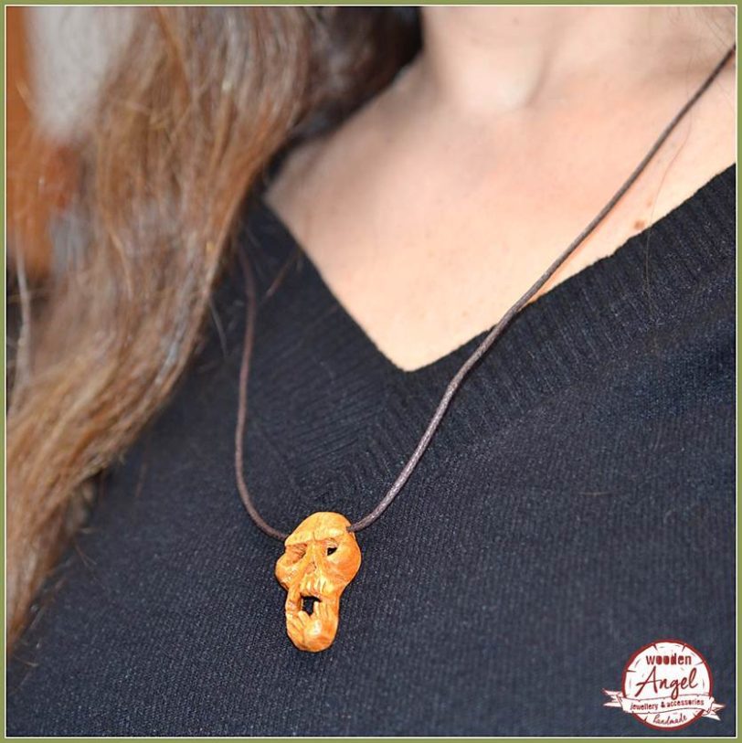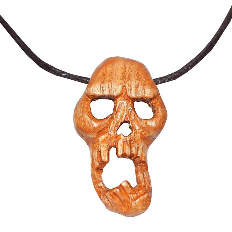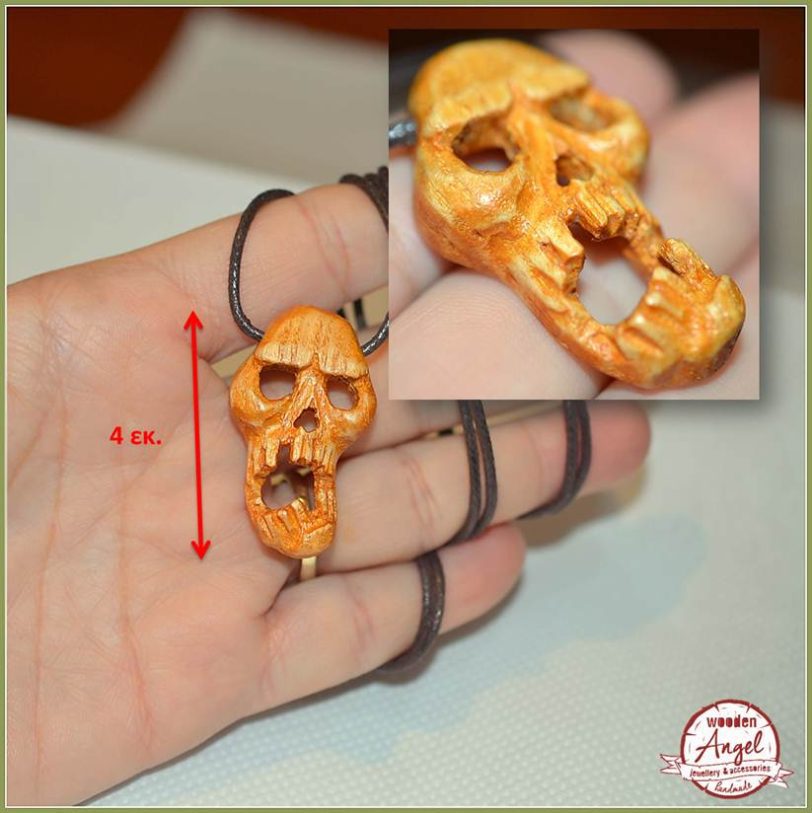 Ένα χειροποίητο ξυλόγλυπτο κολιέ με νεκροκεφαλή σε εκπληκτική λεπτομέρεια.