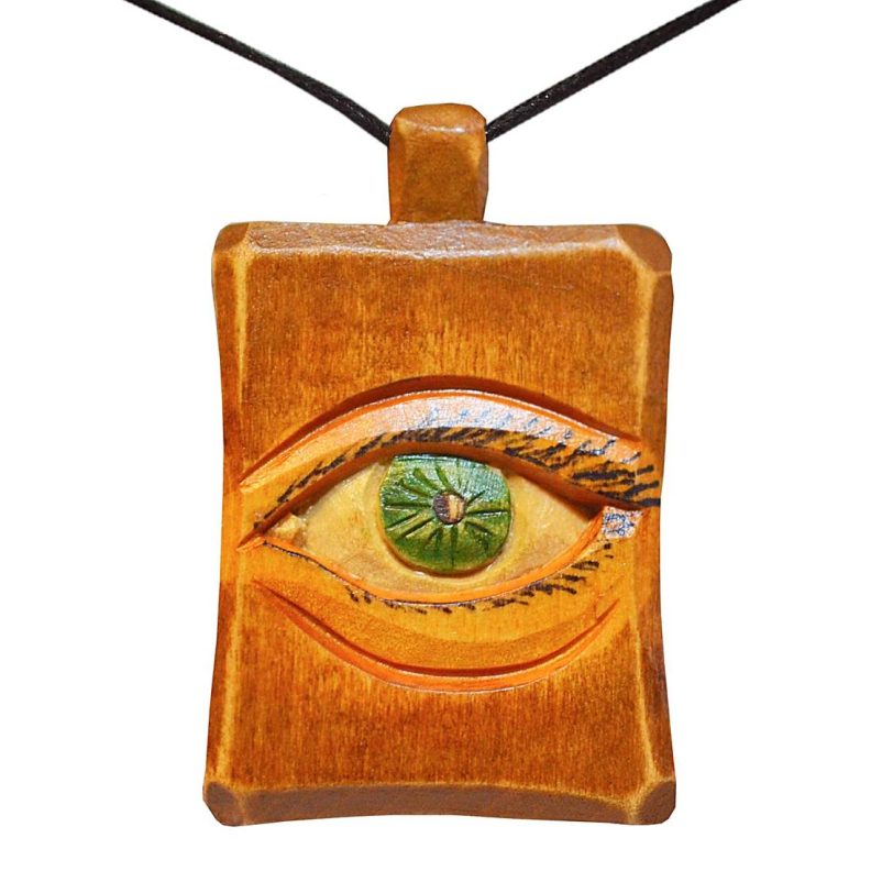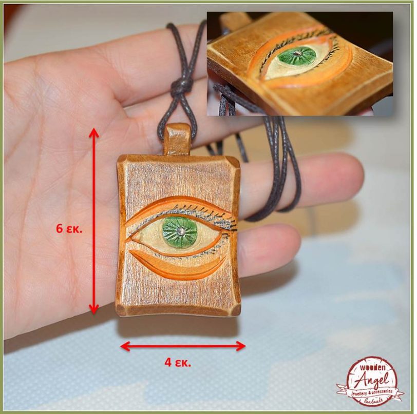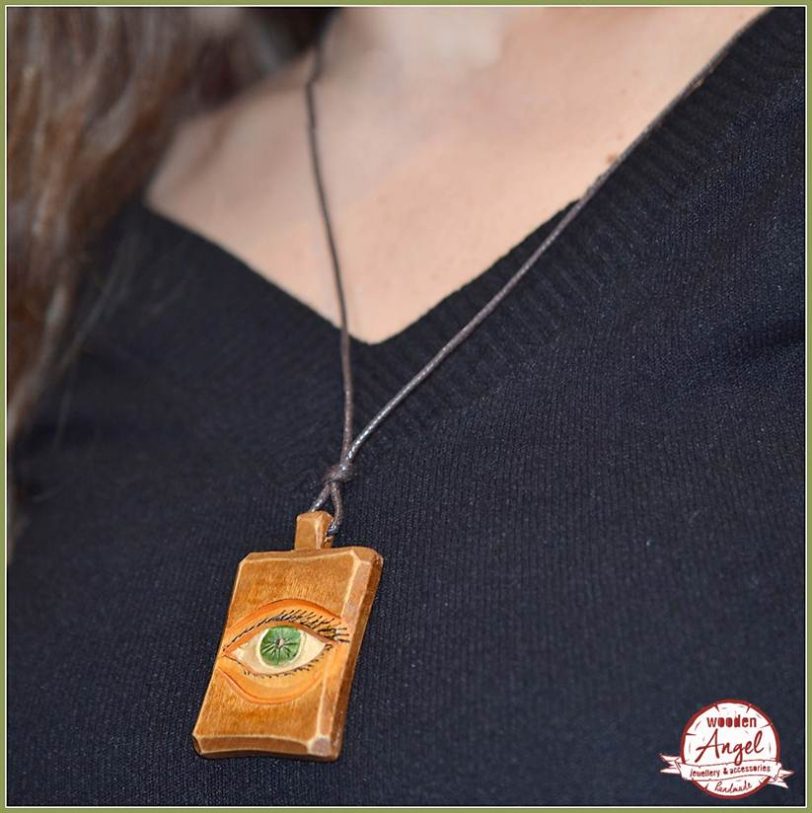 Ένα χειροποίητο ξυλόγλυπτο κολιέ με ορθογώνιο μοτίφ με πράσινο μάτι. Ένα μοντέρνο κόσμημα που θα αγαπηθεί.