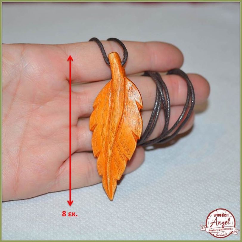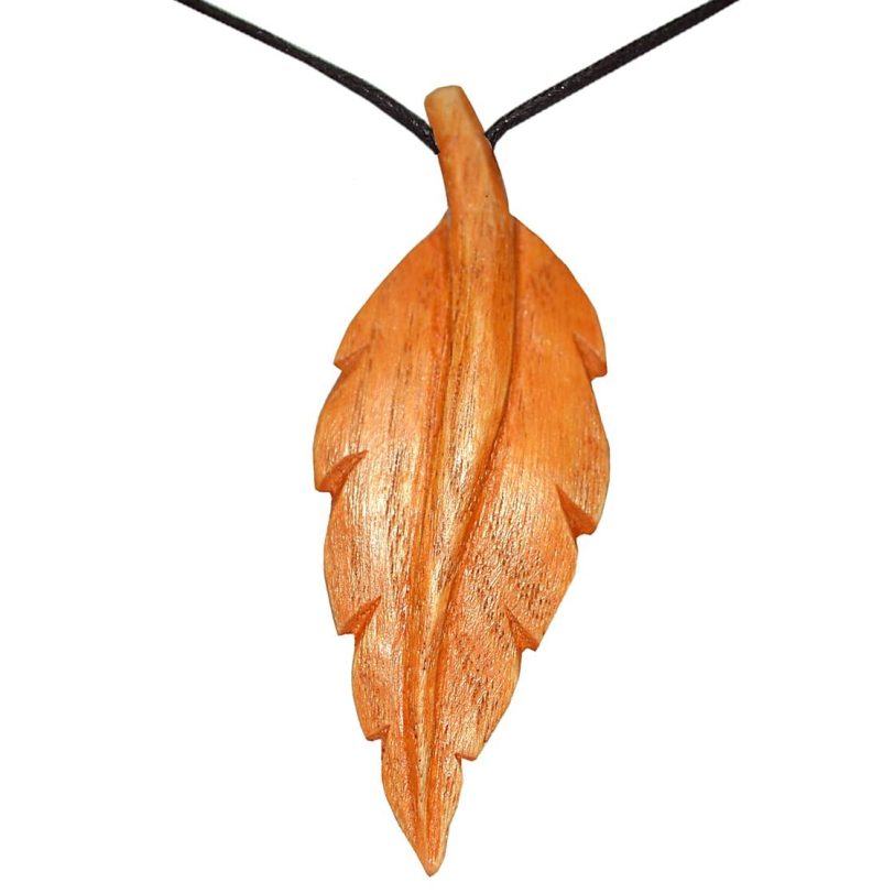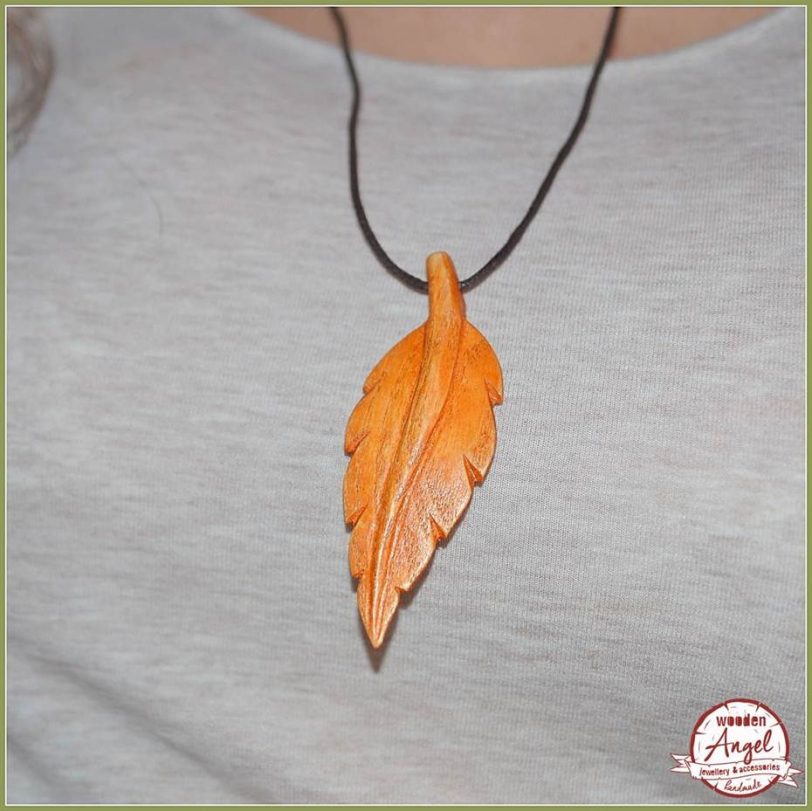 Ένα κομψό χειροποίητο ξυλόγλυπτο κολιέ σε σχέδιο μικρού φτερού με βαμβακερό κερωμένο κορδόνι με κόμπο.