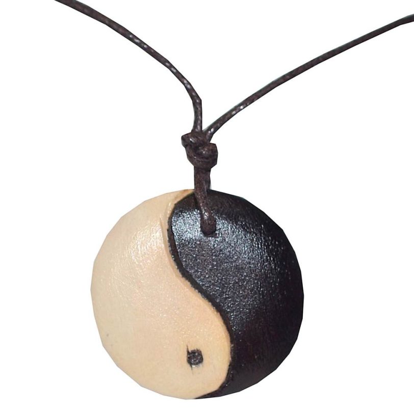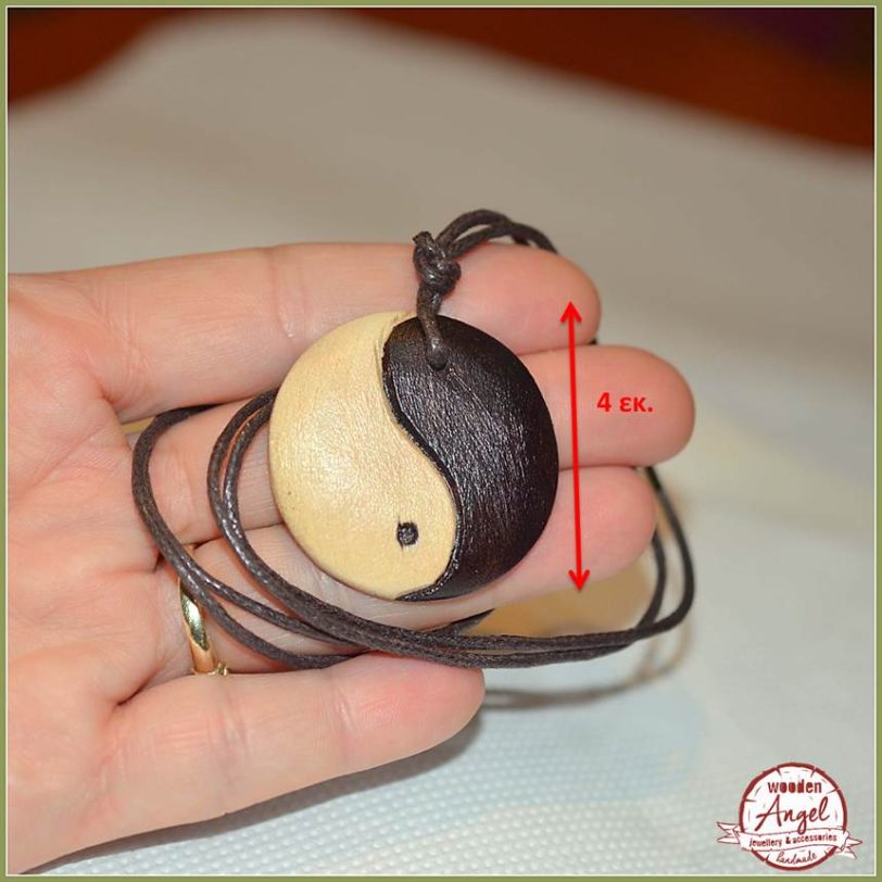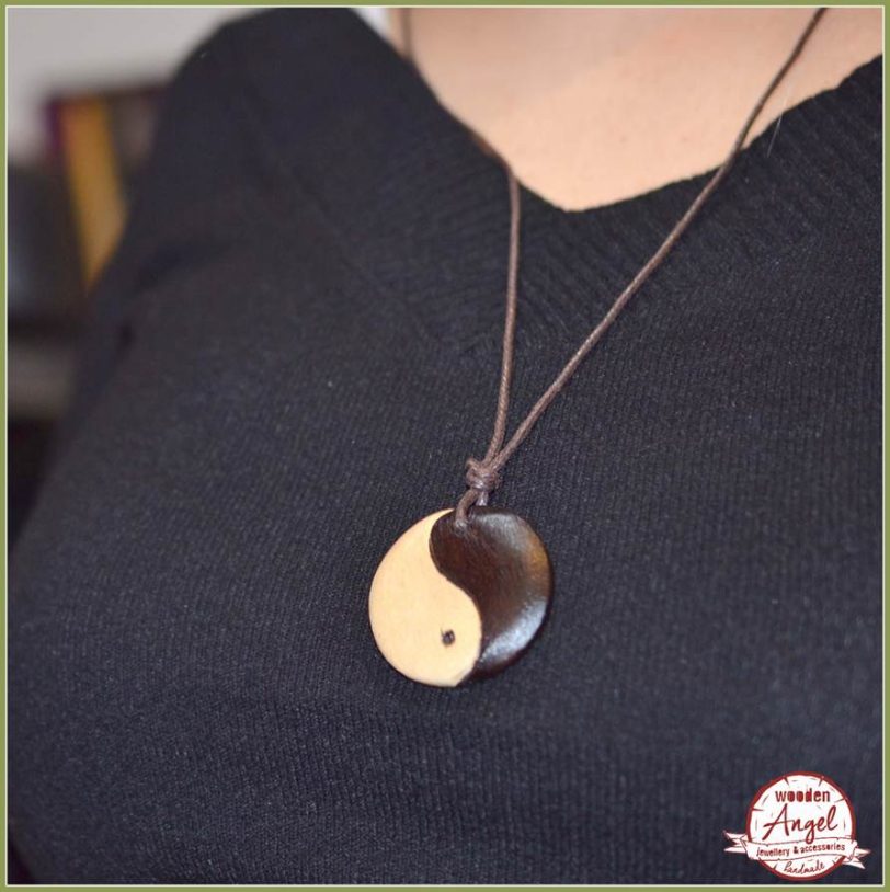 Ένα χειροποίητο ξυλόγλυπτο κολιέ με μοτίφ ying-yang.