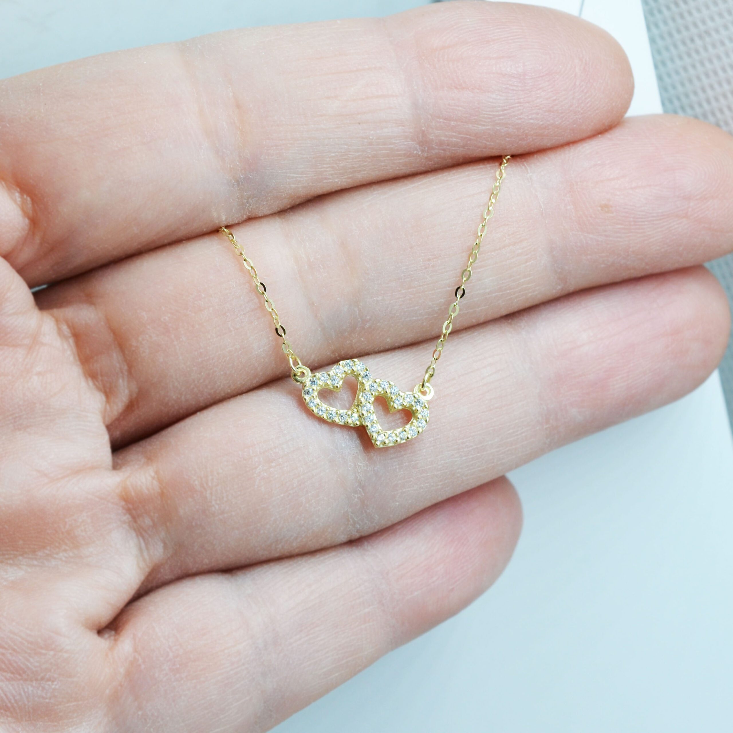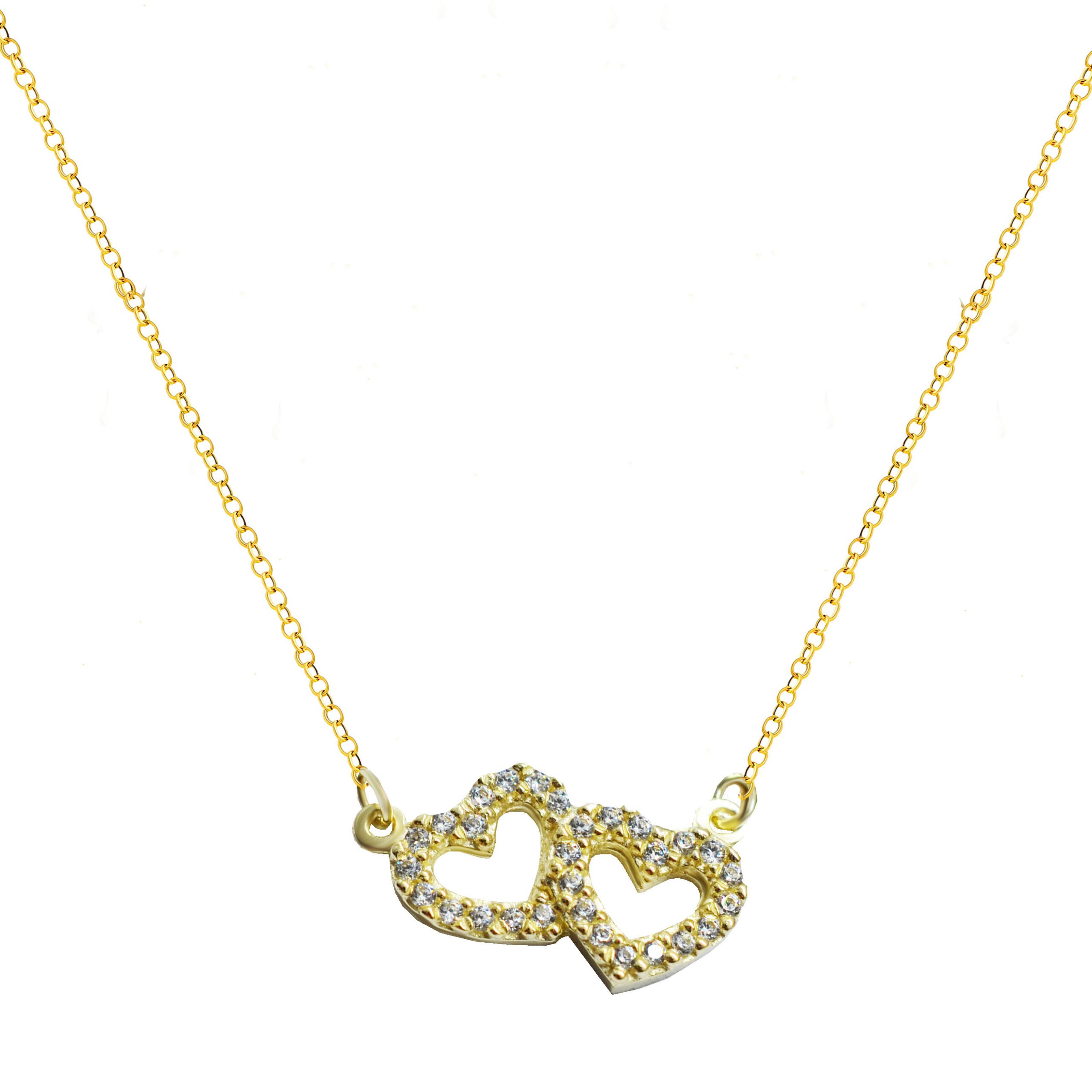 Χρυσό κολιέ με διπλές καρδιές διακοσμημένες με λευκές πέτρες.