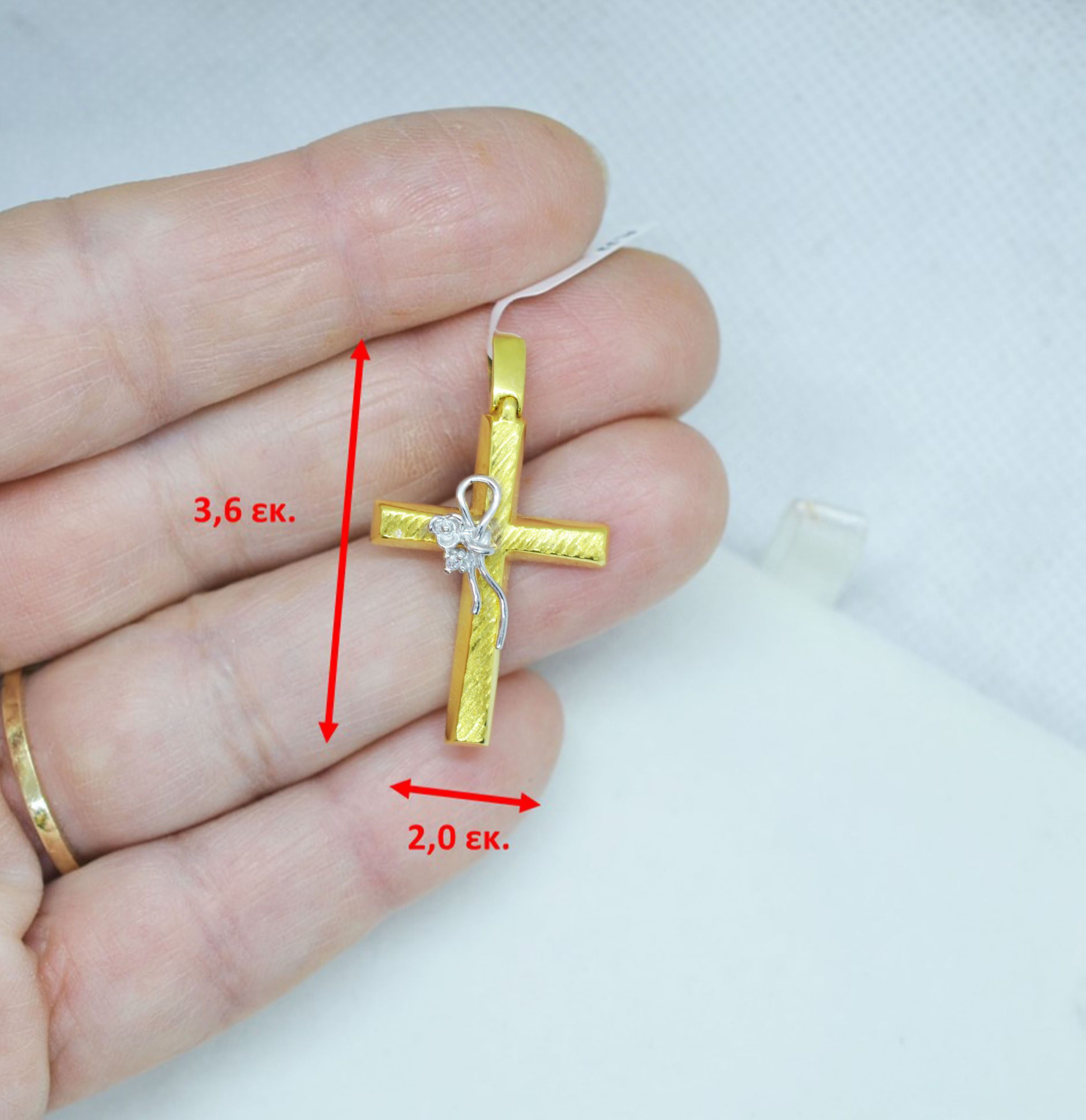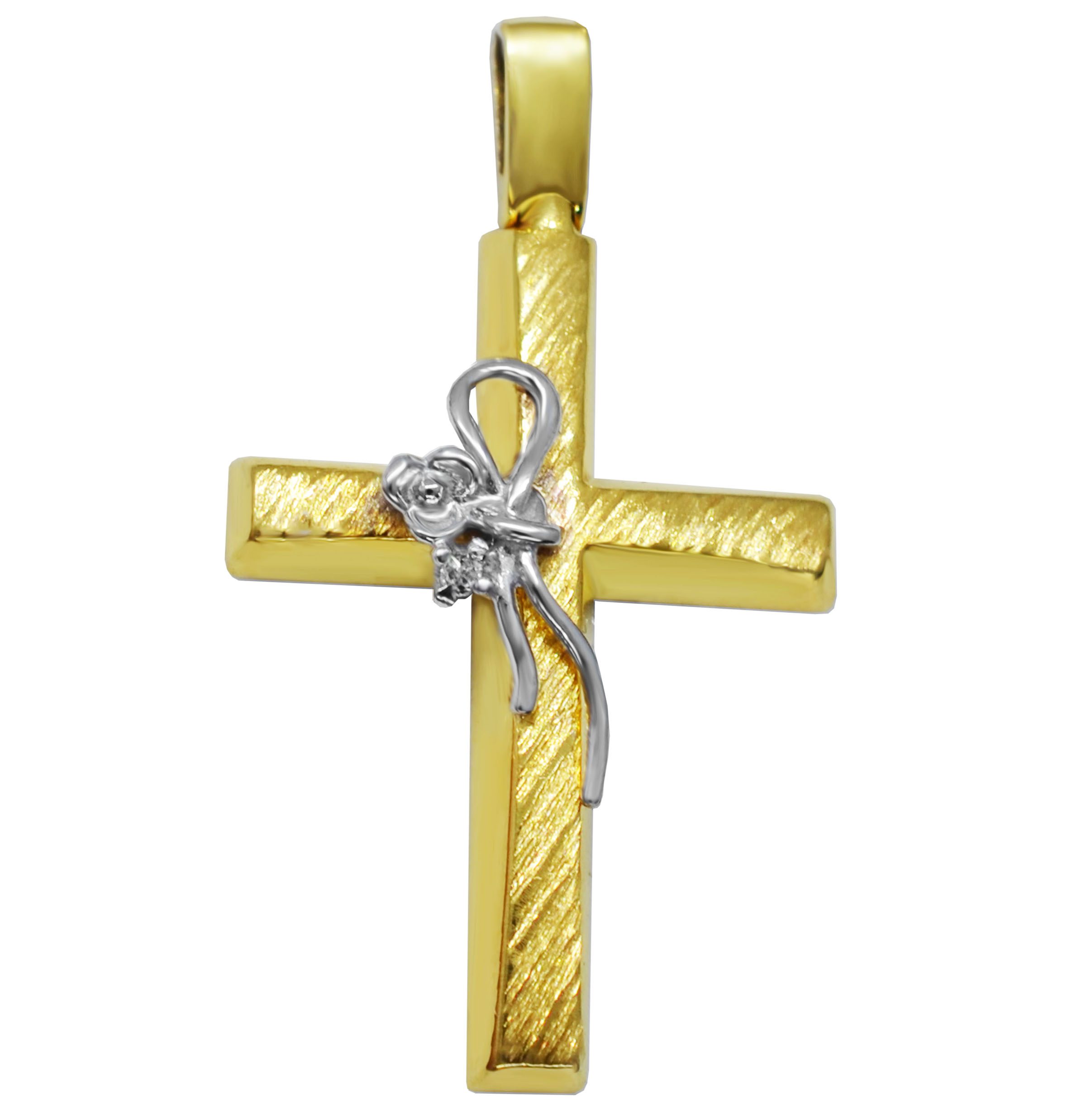 Χρυσός βαπτιστικός σταυρός με διχρωμία με διακόσμηση λουλούδι.