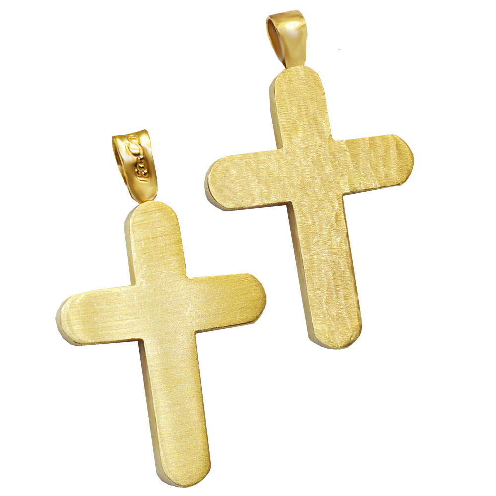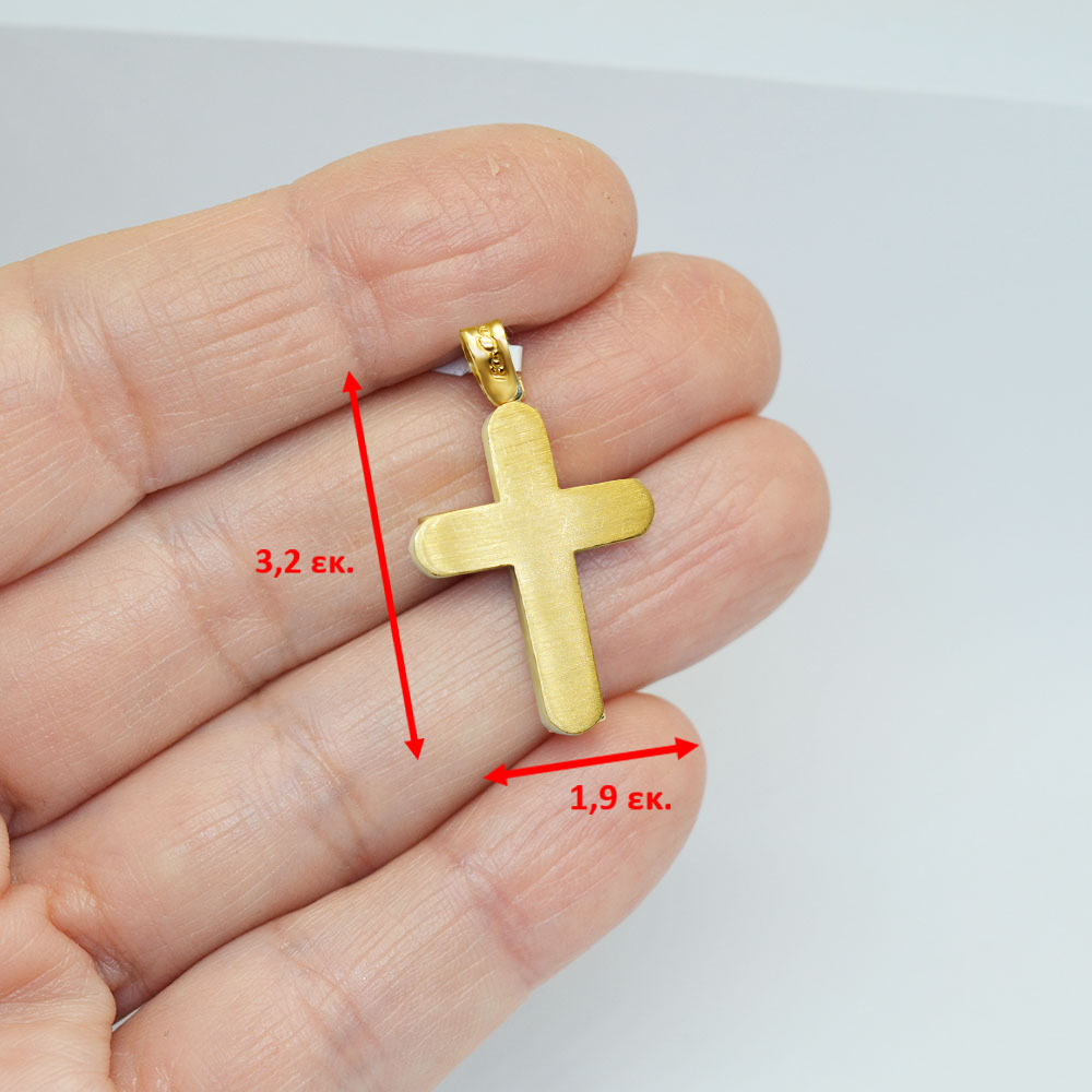 Χρυσός βαπτιστικός σταυρός διπλής όψης με ματ φινίρισμα ανάγλυφη.