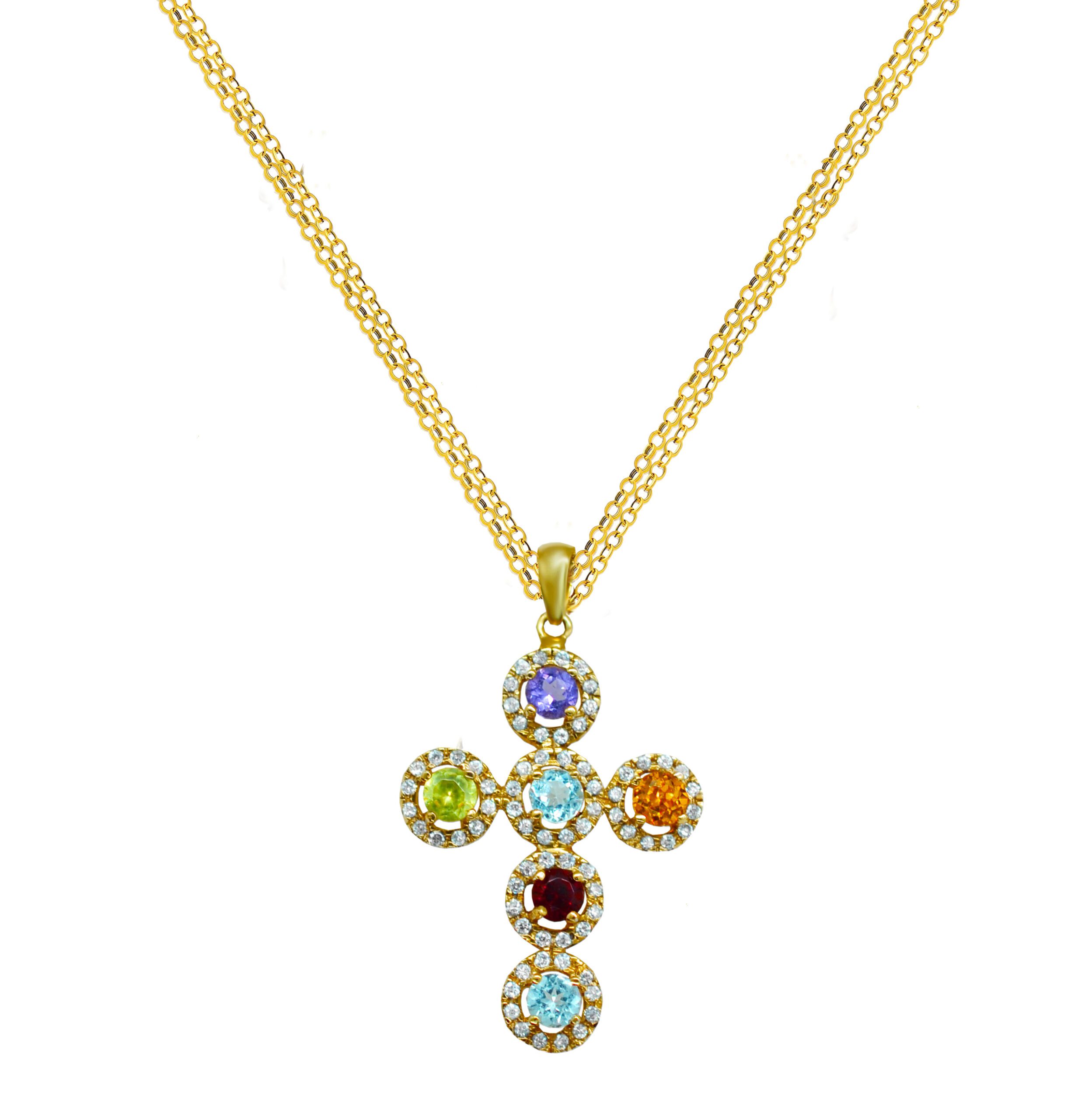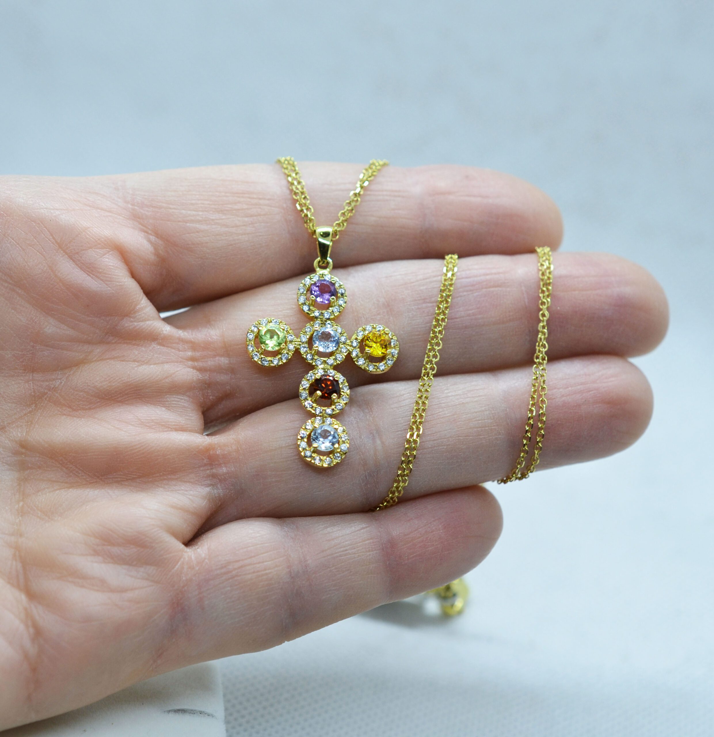 Χρυσό κολιέ με μεγάλο σταυρό διαστάσεων 3,8Χ2,2 εκ. με πολύχρωμες πέτρες.