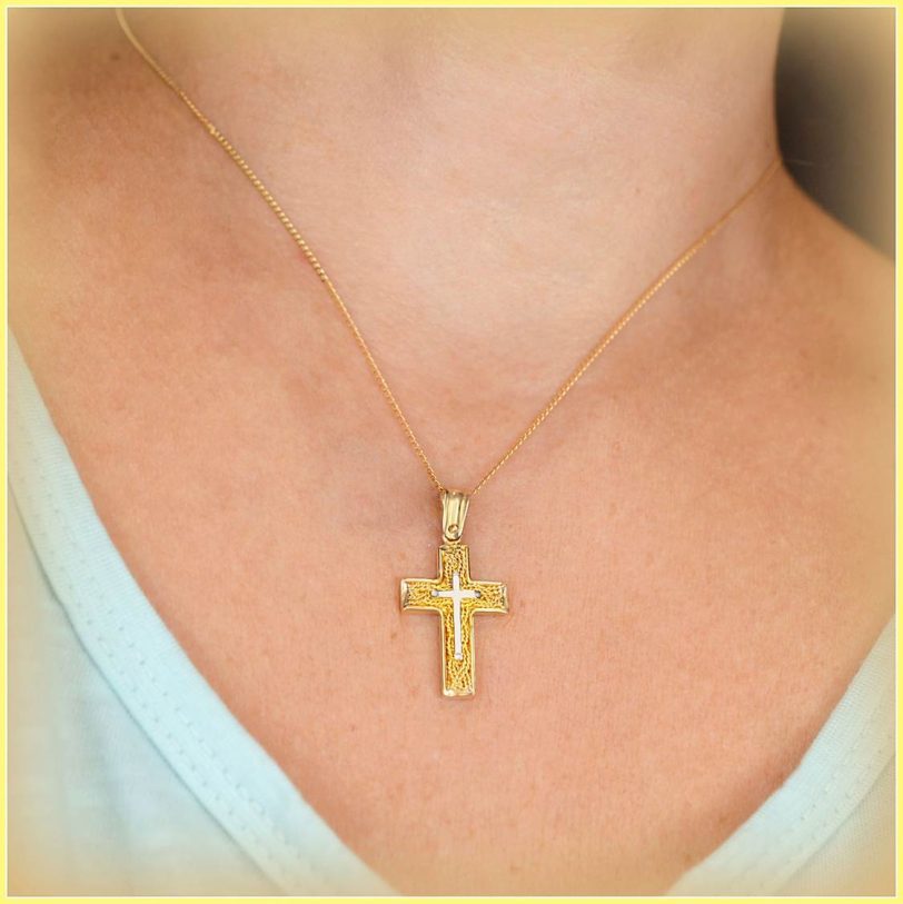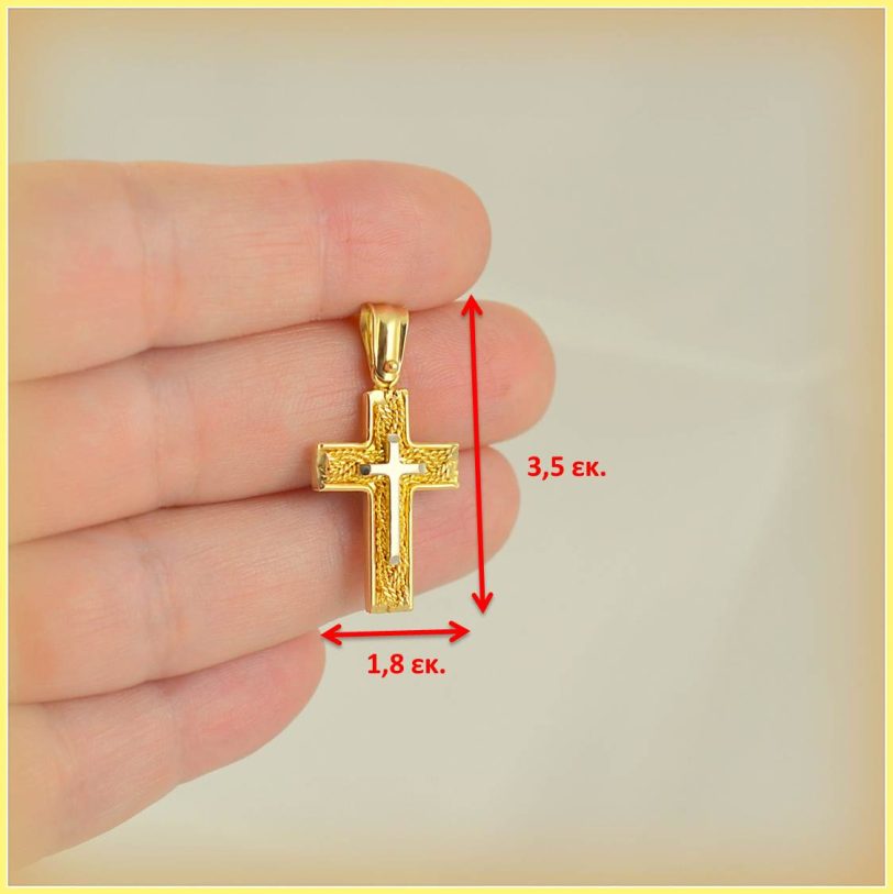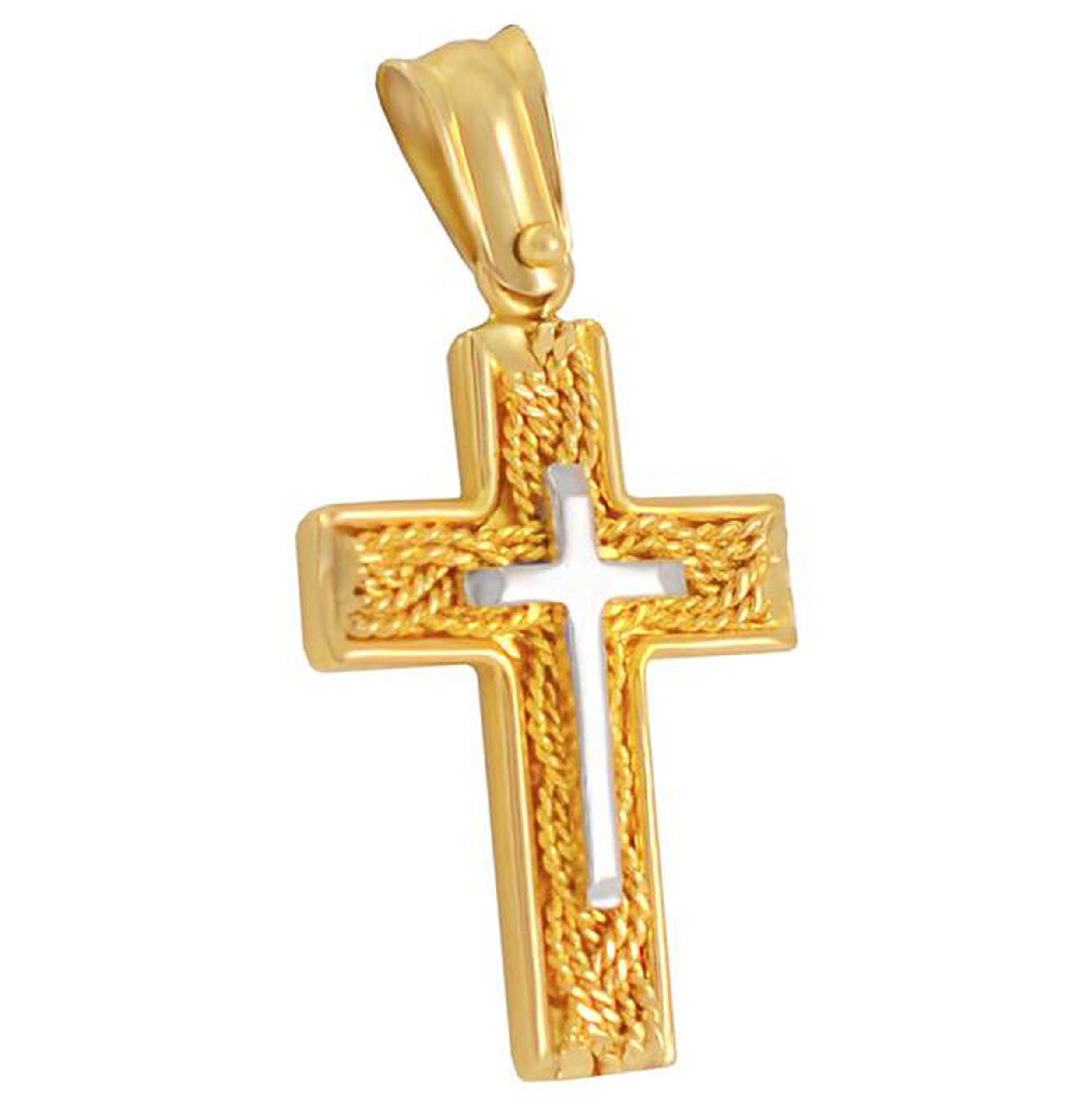 Χρυσός βαπτιστικός σταυρός με υπέροχο συρματερό φόντο πίσω από έναν λευκόχρυσο σταυρό. Ένα κομψό κόσμημα και μια ιδανική επιλογή για βάπτιση κοριτσιών που θα εντυπωσιάσει.