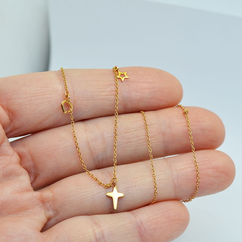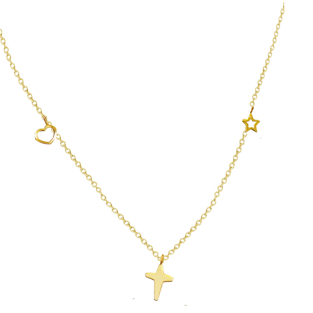 Χρυσό κολιέ με κρεμαστά στοιχεία καρδιά, αστέρι και σταυρουδάκι.