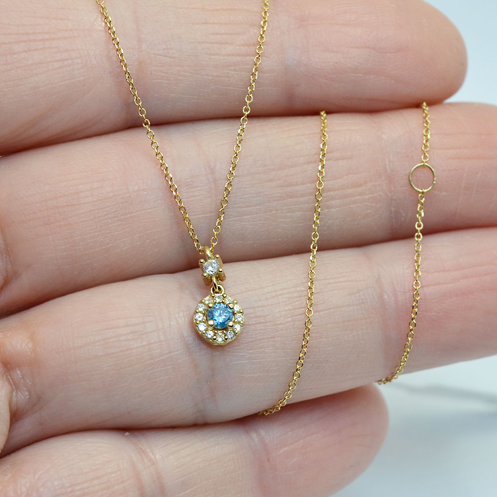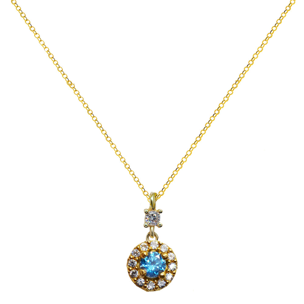 Χρυσό κολιέ με κρεμαστό μοτίφ ροζέτα με γαλάζια και λευκές πέτρες.