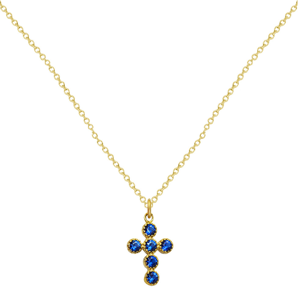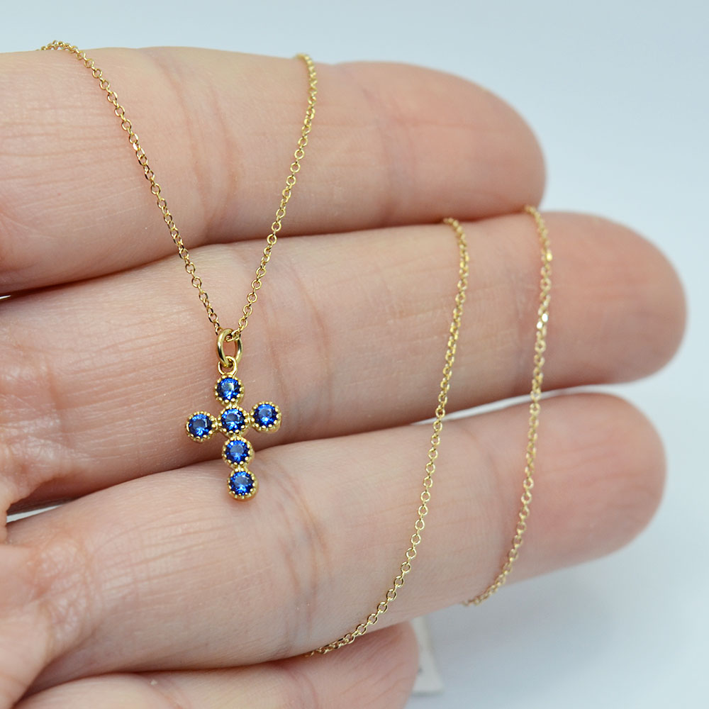 Χρυσό κολιέ με σταυρό διακοσμημένο με μπλε πέτρες.