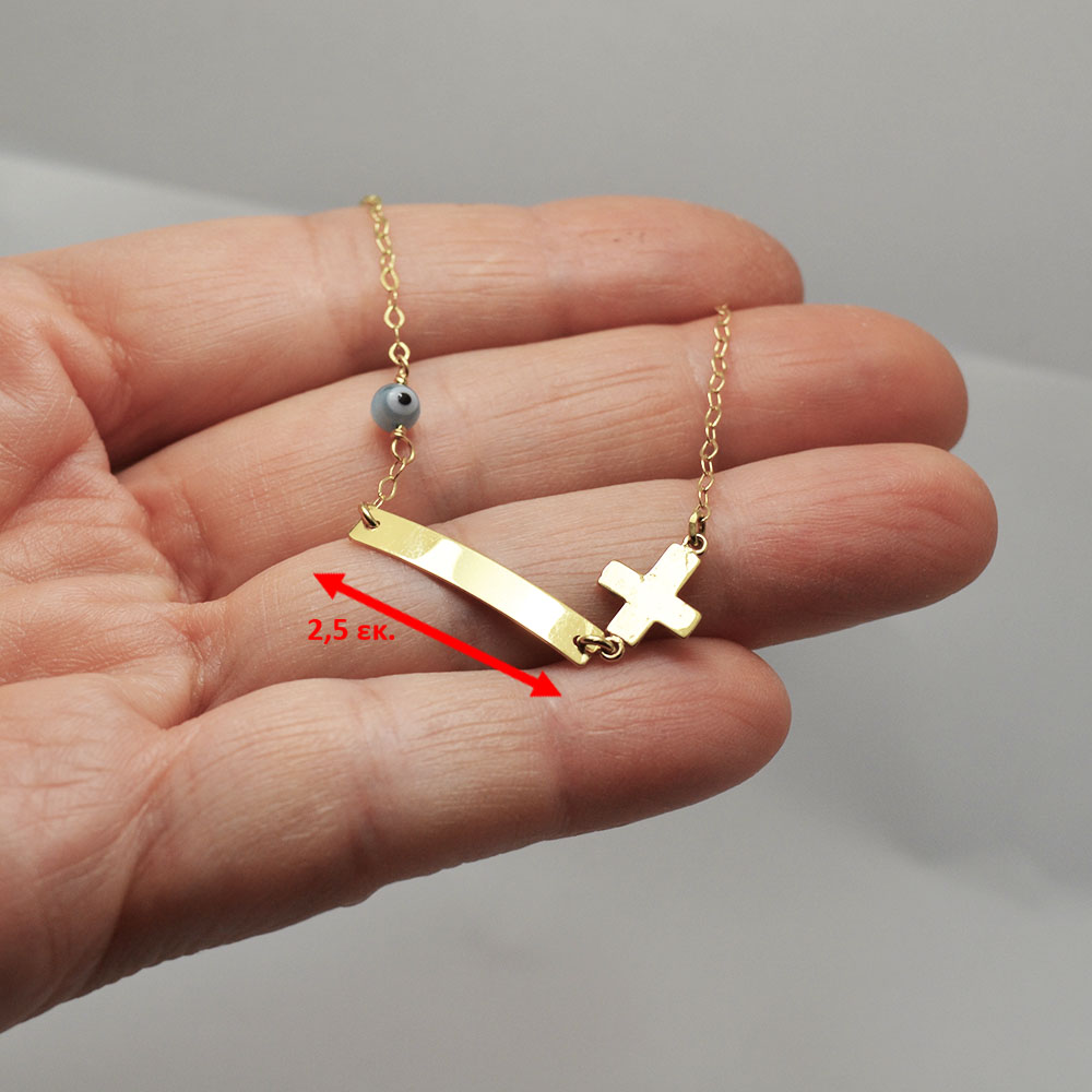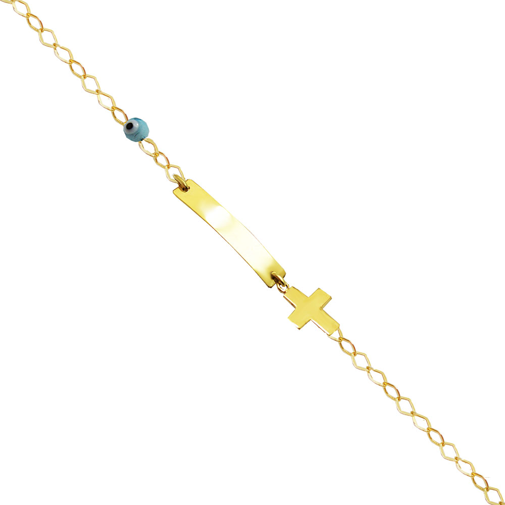 Χρυσή παιδική ταυτότητα χεριού με μοτίφ ματάκι και σταυρουδάκι. Στην πλακέτα μπορείτε να μας ζητήσετε να χαράξουμε όνομα. Ένα όμορφο δώρο και για νεογέννητα.