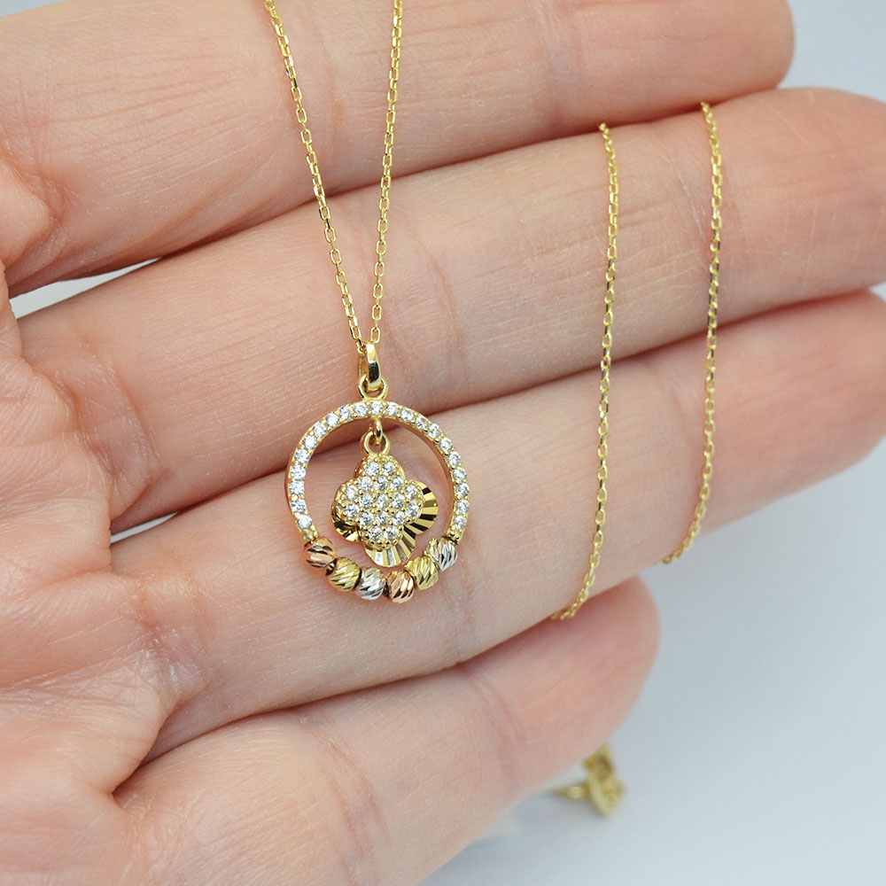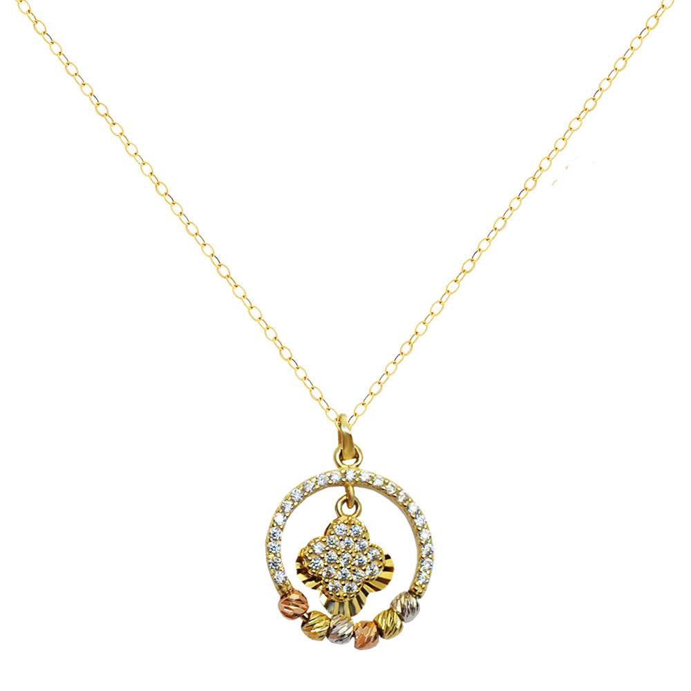 Χρυσό κολιέ με στρογγυλό μοτίφ με πέτρες και χρωματιστά στοιχεία.