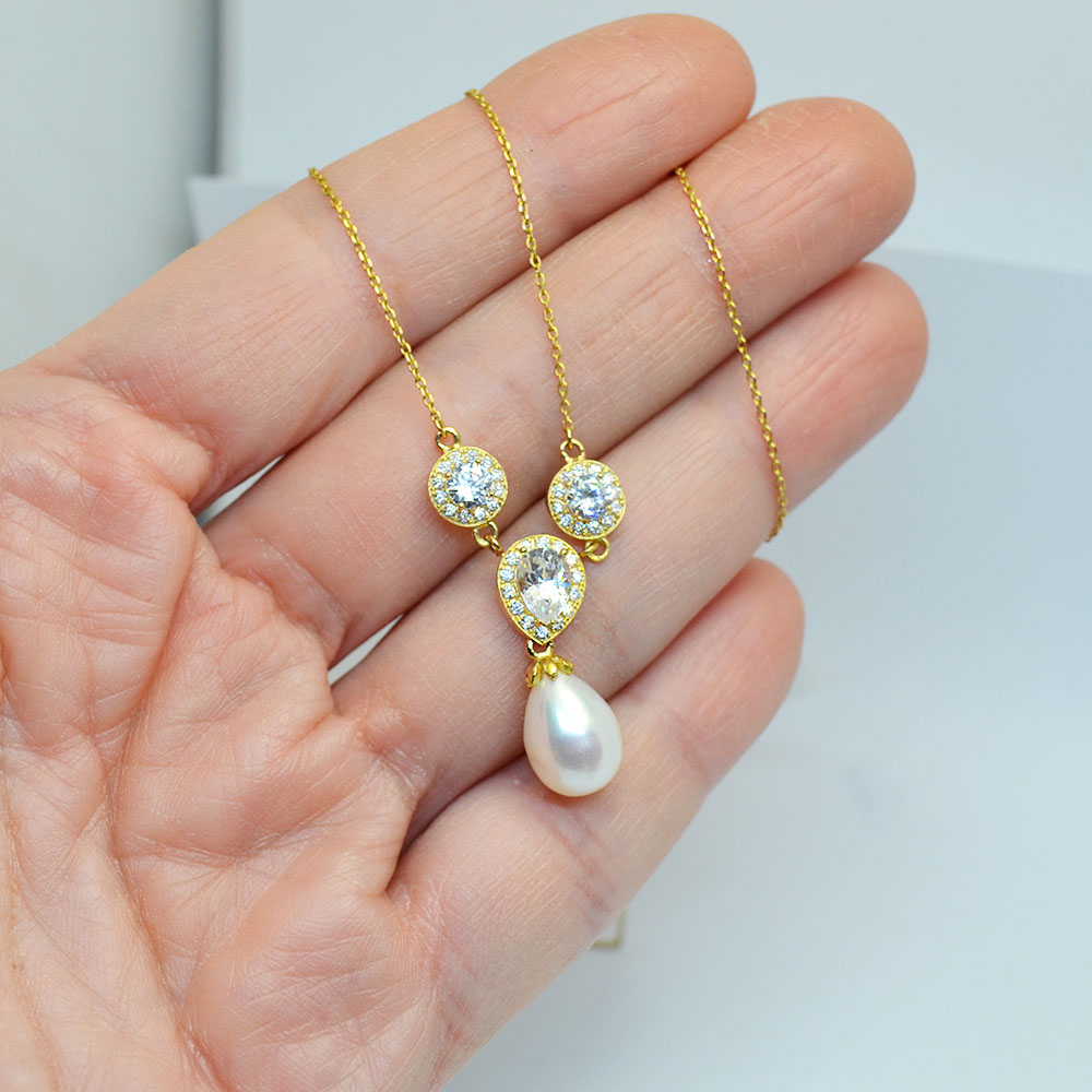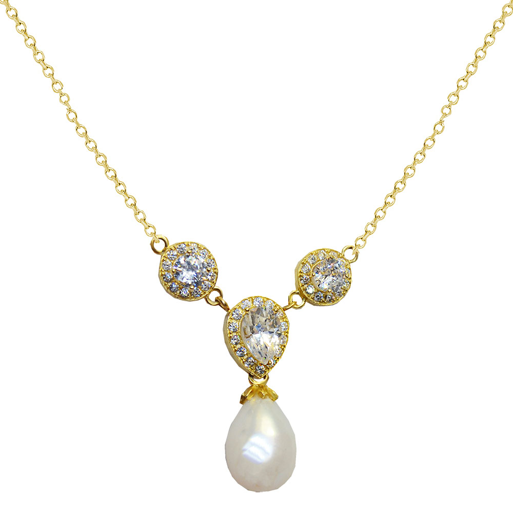 Χρυσό κολιέ με μεγάλο κρεμαστό μαργαριτάρι και μοτίφ με λευκές ζιργκόν πέτρες.