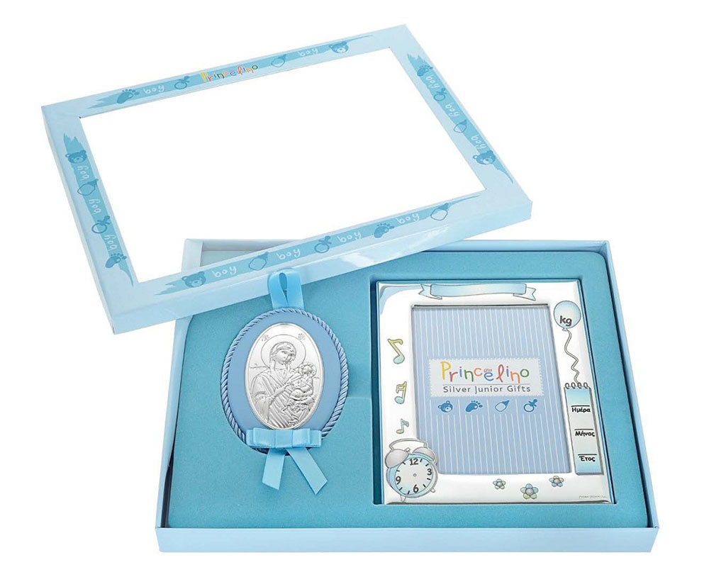 Σετ 2 τεμαχίων που αποτελείται από ασημένια κορνίζα διαστάσεων 6Χ9 εκ. και εικόνα Παναγίας για την κούνια του μωρού. Ένα όμορφο και χρηστικό δώρο για γέννηση ή βάφτιση βρέφους. Υπάρχει και σε ροζ κι επίσης σετ με κορνίζα 9Χ13 εκ, ρωτήστε μας.
