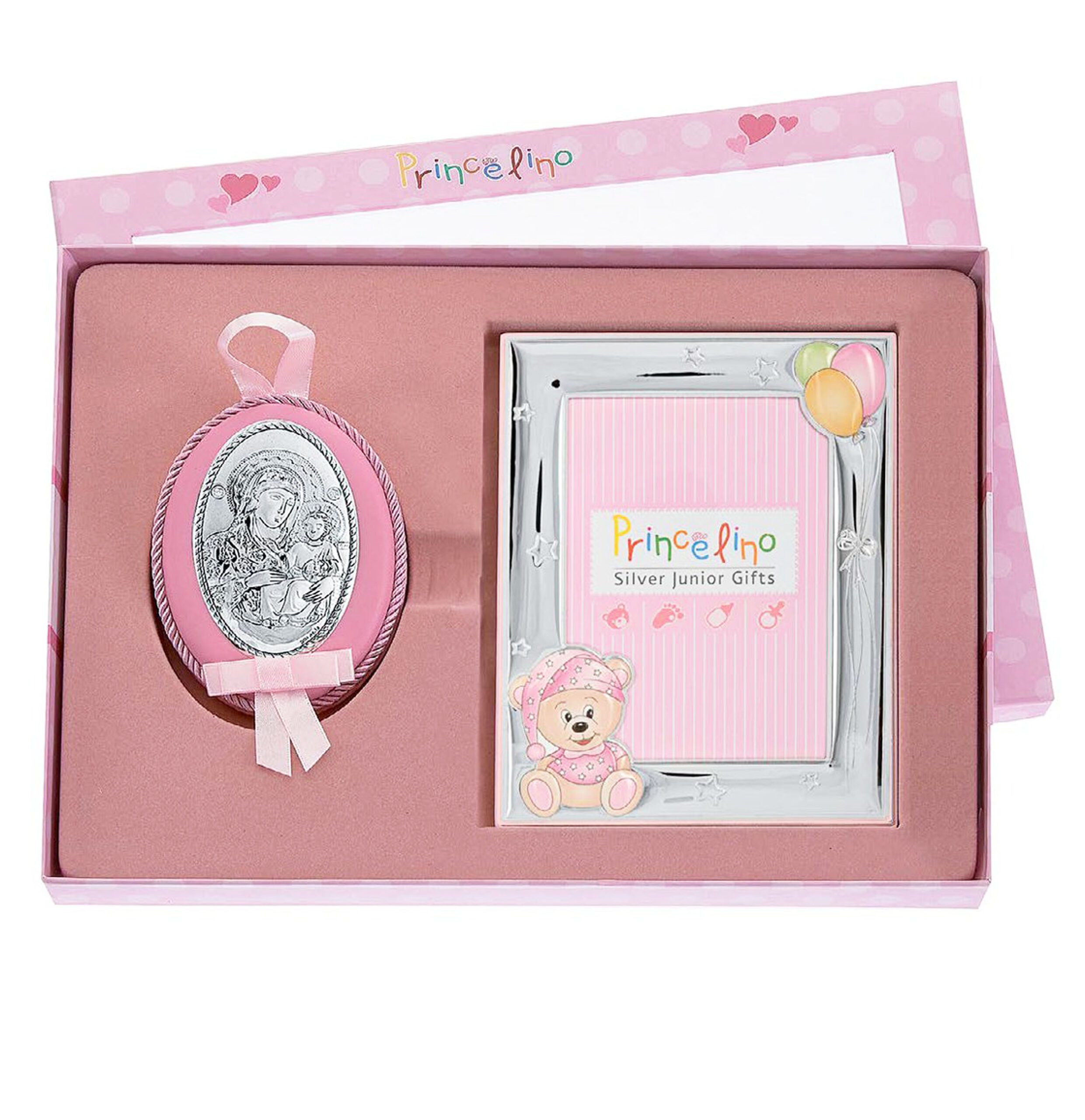 Σετ 2 τεμαχίων που αποτελείται από ασημένια κορνίζα διαστάσεων 9Χ13 εκ. και εικόνα Παναγίας για την κούνια του μωρού. Ένα όμορφο και χρηστικό δώρο για γέννηση ή βάφτιση βρέφους. Υπάρχει και σε γαλάζιο.