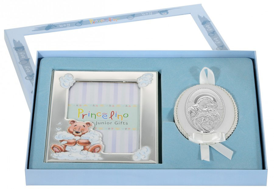 Σετ 2 τεμαχίων που αποτελείται από ασημένια κορνίζα διαστάσεων 9Χ13 εκ. και εικόνα Παναγίας για την κούνια του μωρού. Ένα όμορφο και χρηστικό δώρο για γέννηση ή βάφτιση βρέφους.