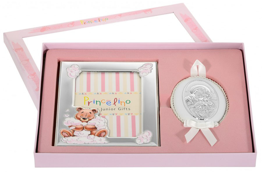 Σετ 2 τεμαχίων που αποτελείται από ασημένια κορνίζα διαστάσεων 9Χ13 εκ. και εικόνα Παναγίας για την κούνια του μωρού. Ένα όμορφο και χρηστικό δώρο για γέννηση ή βάφτιση βρέφους.