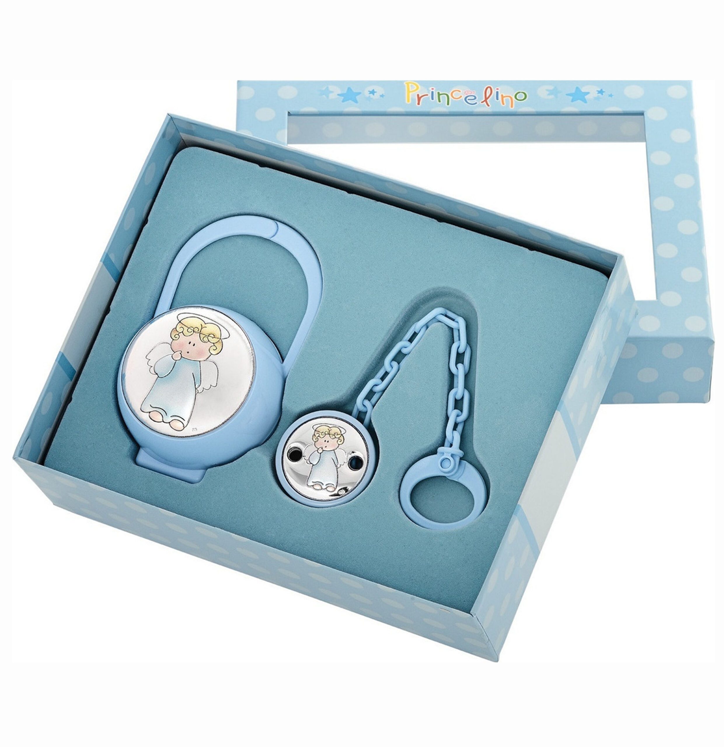 Σετ 2 τεμαχίων που αποτελείται από θήκη και κλιπ πιπίλας με διακόσμηση χρωματιστό αγγελάκι. Ένα όμορφο και χρηστικό δώρο για γέννηση ή βάφτιση βρέφους.