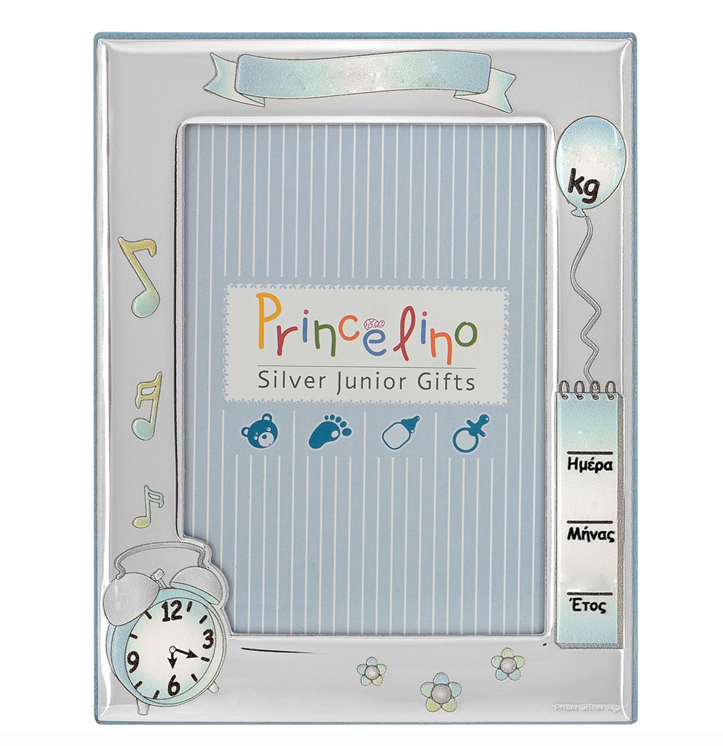 Ασημένια κορνίζα όπου με ανεξίτηλο μαρκαδόρο μπορείτε να γράψετε ημερομηνία γέννησης, κιλά & όνομα παιδιού. Ένα όμορφο και χρηστικό δώρο για γέννηση ή βάφτιση βρέφους.