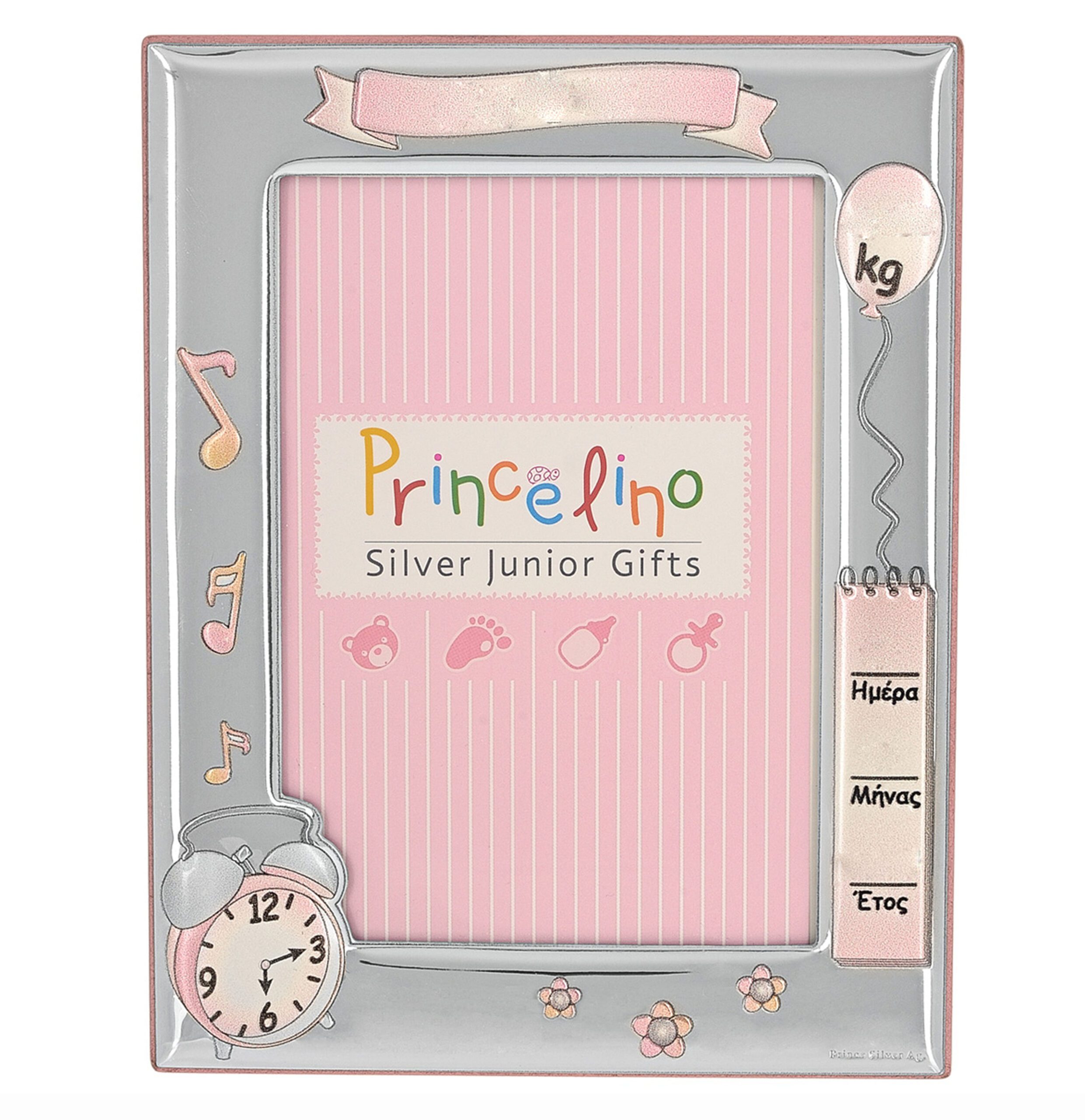 Ασημένια κορνίζα όπου με ανεξίτηλο μαρκαδόρο μπορείτε να γράψετε ημερομηνία γέννησης, κιλά & όνομα παιδιού. Ένα όμορφο και χρηστικό δώρο για γέννηση ή βάφτιση βρέφους.