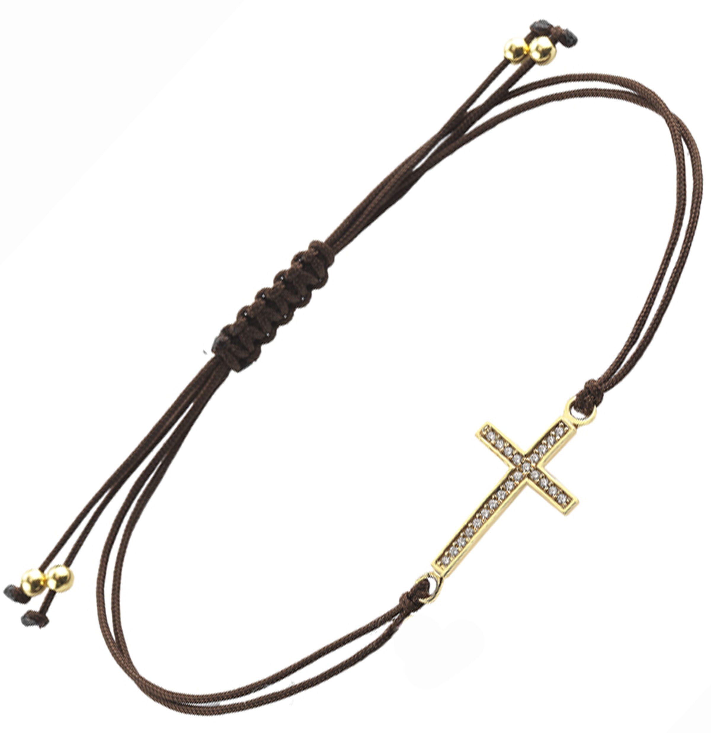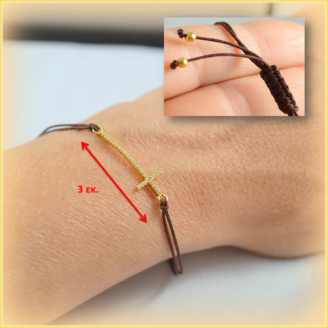 Βραχιόλι μακραμέ με χρυσό διακοσμητικό στοιχείο σταυρό με λευκά ζιργκόν. Μοντέρνο κόσμημα για κάθε ηλικία.