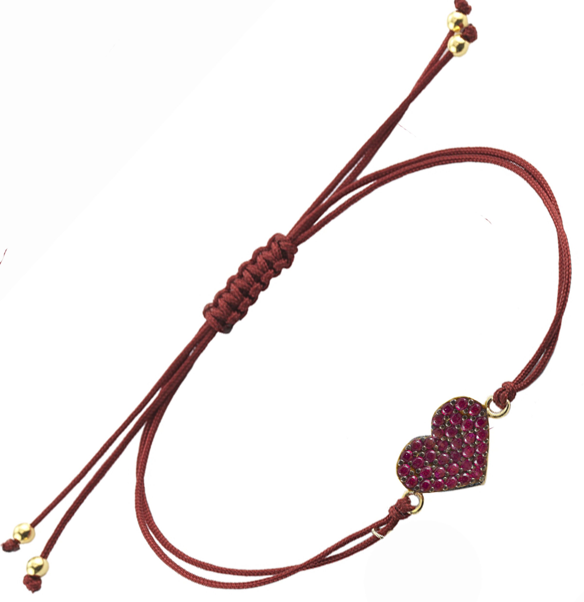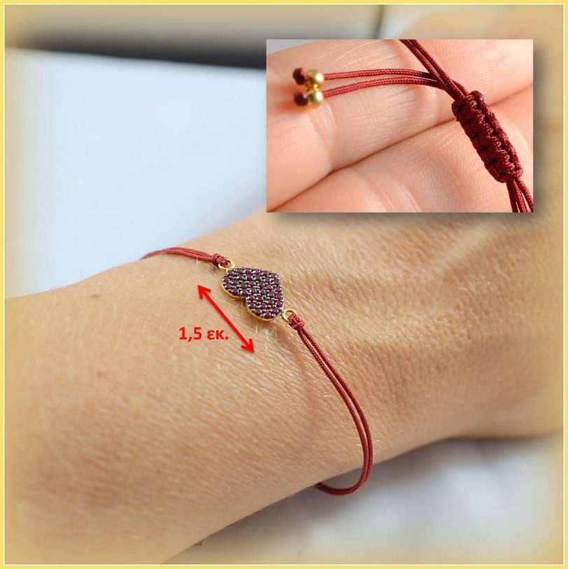 Βραχιόλι μακραμέ με χρυσό στοιχείο καρδιά με μπορντό πέτρες. Όμορφο κόσμημα για εκείνην που αγαπάτε.