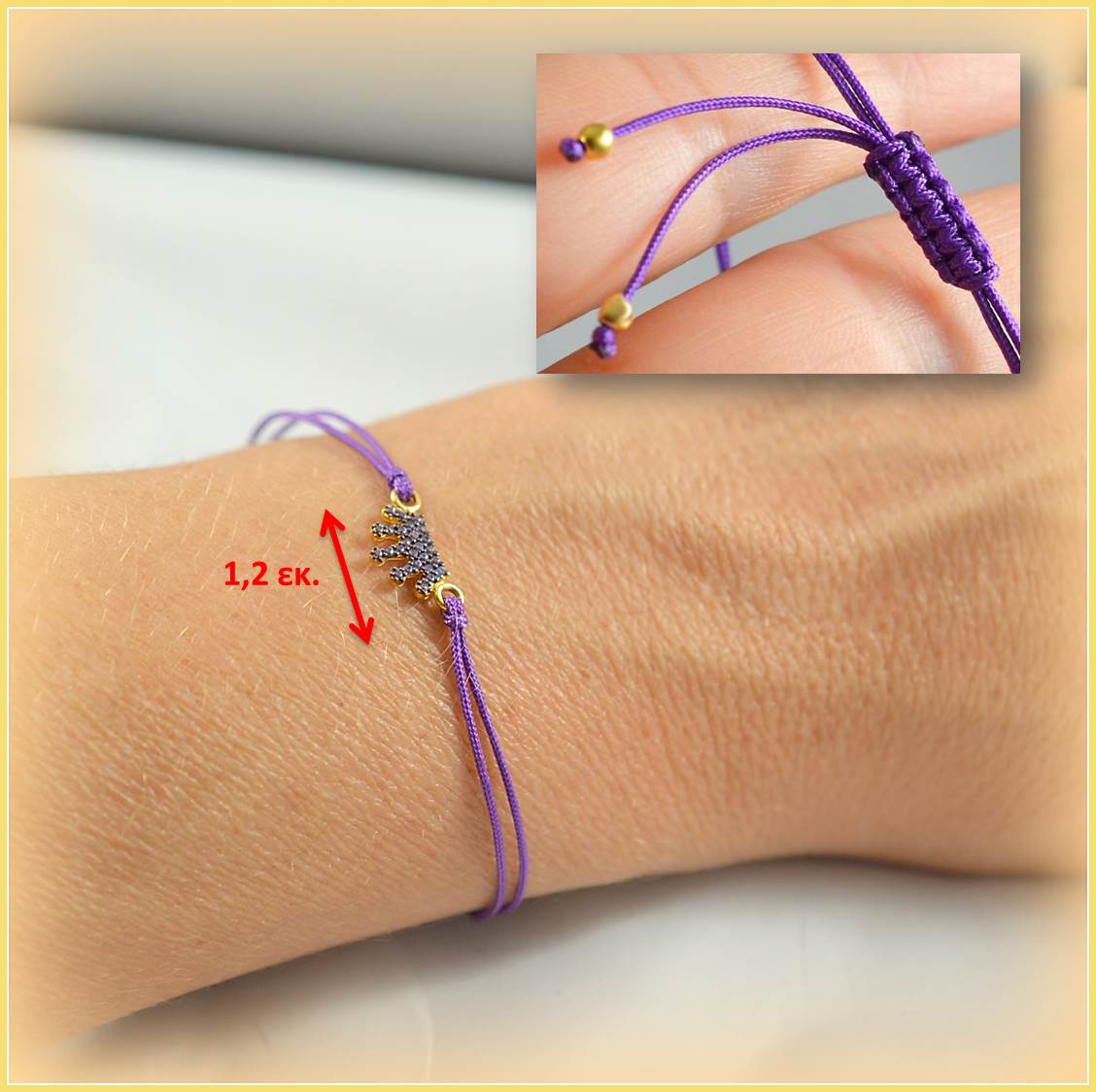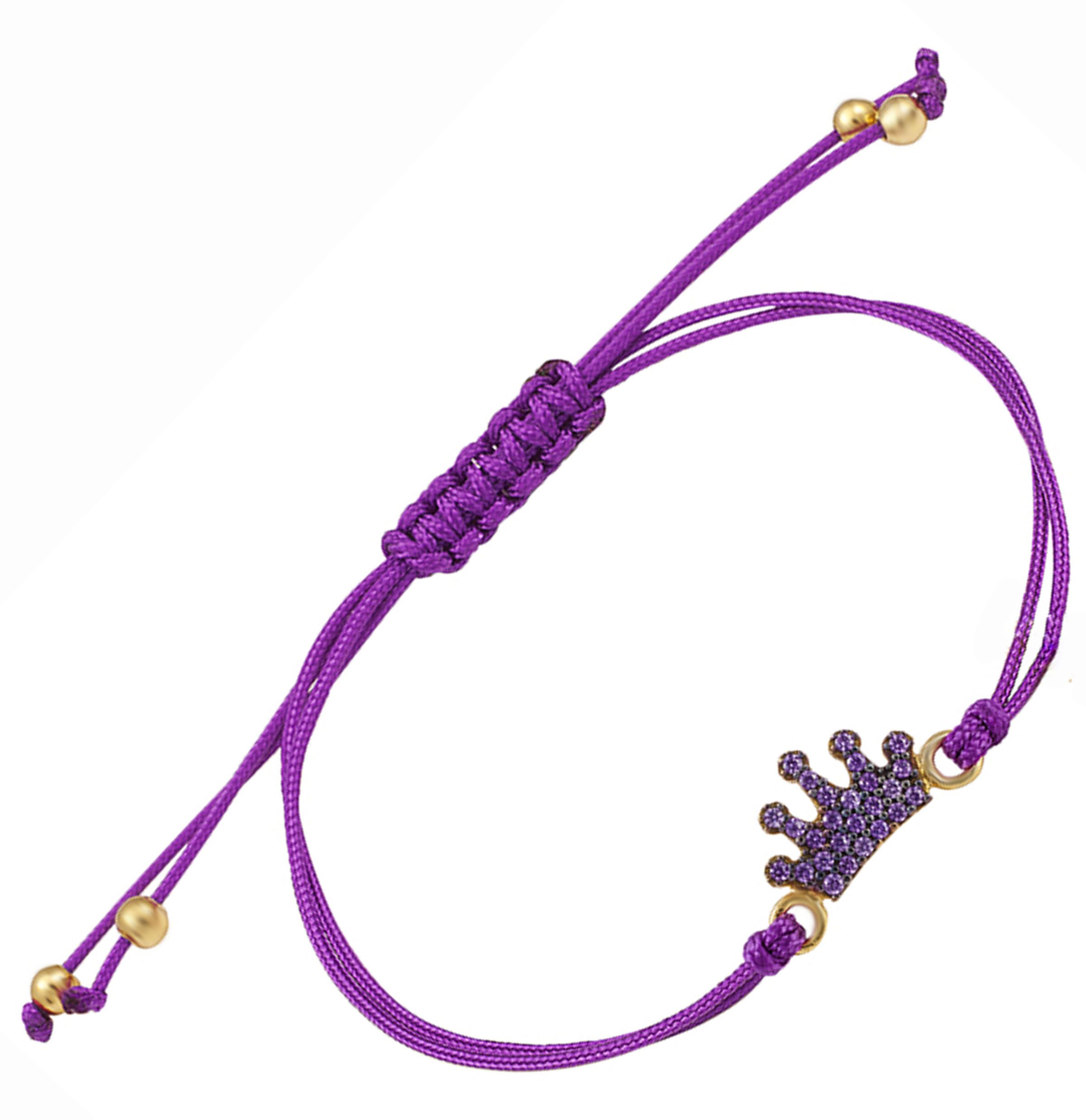 Βραχιόλι μακραμέ με χρυσό διακοσμητικό σε στέμμα με λιλά ζιργκόν πέτρες. Μοντέρνο κόσμημα για κάθε ηλικία.