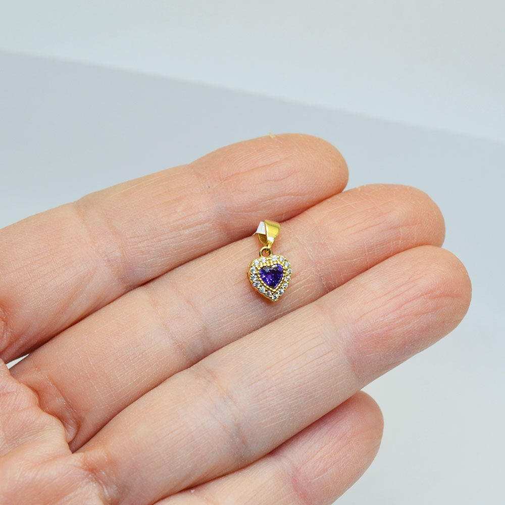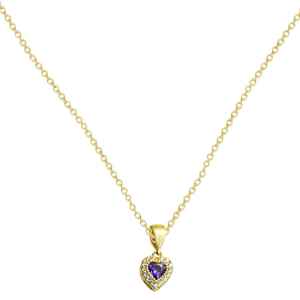 Χρυσό κολιέ με κρεμαστό μοτίφ καρδιά με λευκές και μωβ πέτρες.